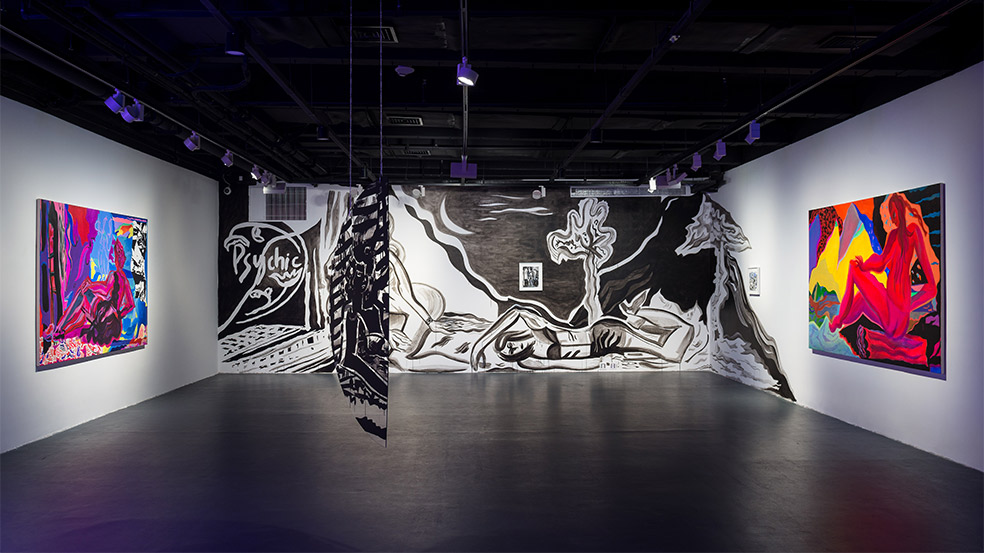 自2015年夏天开始,米拉·丹西就已经着手准备此次个展。“我开始为这个展览创作草图,特意考虑了作品在上海展出的文化意义。时间在画中流动,蹒跚前行或是即刻后退都使我在绘画中怡然自乐。上古女神和广告模特赋予我同样的灵感,她们的幻象常常在我的心中相融合。我有一种冲动,想让这些人物形象复活,想具体呈现她们并重新塑造她们——想让她们栖居于“女性”神话般的建构而又不可避免地改变这些建构。我想发掘她,拽她前进——我想听她说话。我想讲一个新的故事。这些问题又引我回顾去年夏天我最初埋下的线索——有关月亮女神嫦娥所经历的流放。展览中的作品图像围绕她的命运出发——如果剥离时间会怎样?一个女人安睡的画面不断重现——她不作回应。整个世界在她的身上落笔——她像山一样美好。她是高山,她是花园,她是橱窗里的标志……她由此重生。”