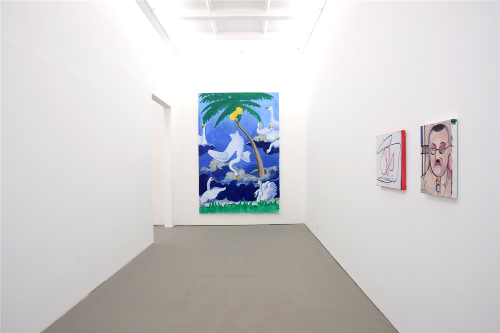 这是艺术家在魔金石空间的第二次个展。如果想对艺术家的作品有更深入的理解,请查阅他的第一次个展“马蒂斯的裙摆”的信息。他的作品之间的关系不是重复,而是遥相呼应。2013 年的“丽达丽达与天鹅”中肉欲的天鹅,而2015 年则为“坏人也能上天堂”中死后进入了天堂的天鹅。参展作品中的标题不只是作品的名称,而是作品意义的延伸和升华,它们的重要性和画布上的线条和颜料一样重要。“抽象艺术家的具象肖像(2016)”画的是肖恩·斯库利穿着睡袍的工作时的情景,既像一个国王又像一个囚犯。这是一幅反讽与悖论的绘画,从标题到画面。面对混搭与挪用方法建构起来的画面,观看时可以借用欣赏周星驰“无厘头”式电影的轻松状态。妓院里裸体的圣诞老人、抱着天鹅的本拉登、娃娃脸的蒙德里安......如果您熟悉艺术史和艺术圈,看武晨的画更加兴趣盎然。他对艺术史中的作品和艺术家进行了篡改、挪用和混搭。艺术圈越来越像黑社会,艺术家谈论艺术就像说着黑话,只有他们自己能懂。如果您不熟悉艺术史和艺术圈,也不要望而却步。误读从来都是阅读的一种方式,往往还有不可预料的创造性。绘画技巧应该和所要表现的相匹配,“画的好”和“画的坏”都是相对于画的内容而言的,也就是“形式和内容的高度统一”。武晨习惯使用丙烯,保留笔触的粗糙感,这样他画画时可以随意修改与添加。玩笑是不能等待的,不然你就会得罪了玩笑。“坏人也能上天堂”是这次展览的标题,它并不意味着“好人就要下地狱”。(此处有删节) 其中第一个字“坏”和最后一个字“堂”都不好辨认,不要紧,可以只读成“人也能上天”。