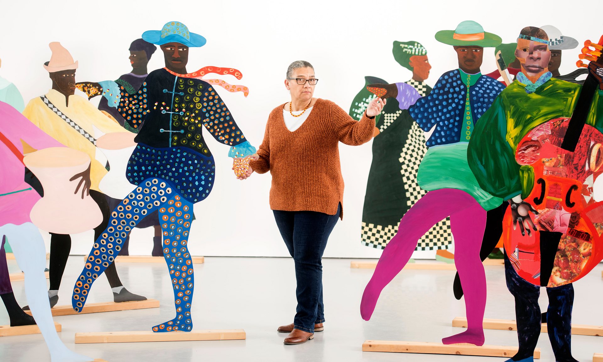 Lubaina Himid with her signature cut-out artworks, representing African slaves in 18th-century royal European courts. Photograph: Adrian Sherratt for the Guardian