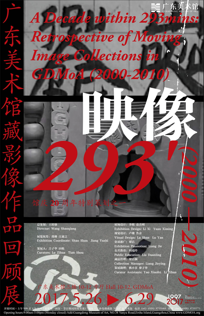 广东美术馆在20周年馆庆之际举办“映像293分钟:广东美术馆藏影像作品回顾展(2000—2010)”,同时我们也将以2017年“广州影像三年展”继承并重新启动“摄影双年展”。一边是对过去的梳理和回顾,一边是对当下的关注及对未来的探索,我们将在动态、变化和发展中去建构中国当代影像艺术发展的历史链条。我们希望本次展览能够给予观众崭新的观看体验,并向社会提供广泛而全面的素材资源,引发公众对于影像艺术的关注,进一步推动中国当代影像艺术的实践与研究。同时感谢为本次展览日夜辛劳的同事们,未来我们还将推出更多优秀的馆藏展示项目,实现藏品活化的理想。