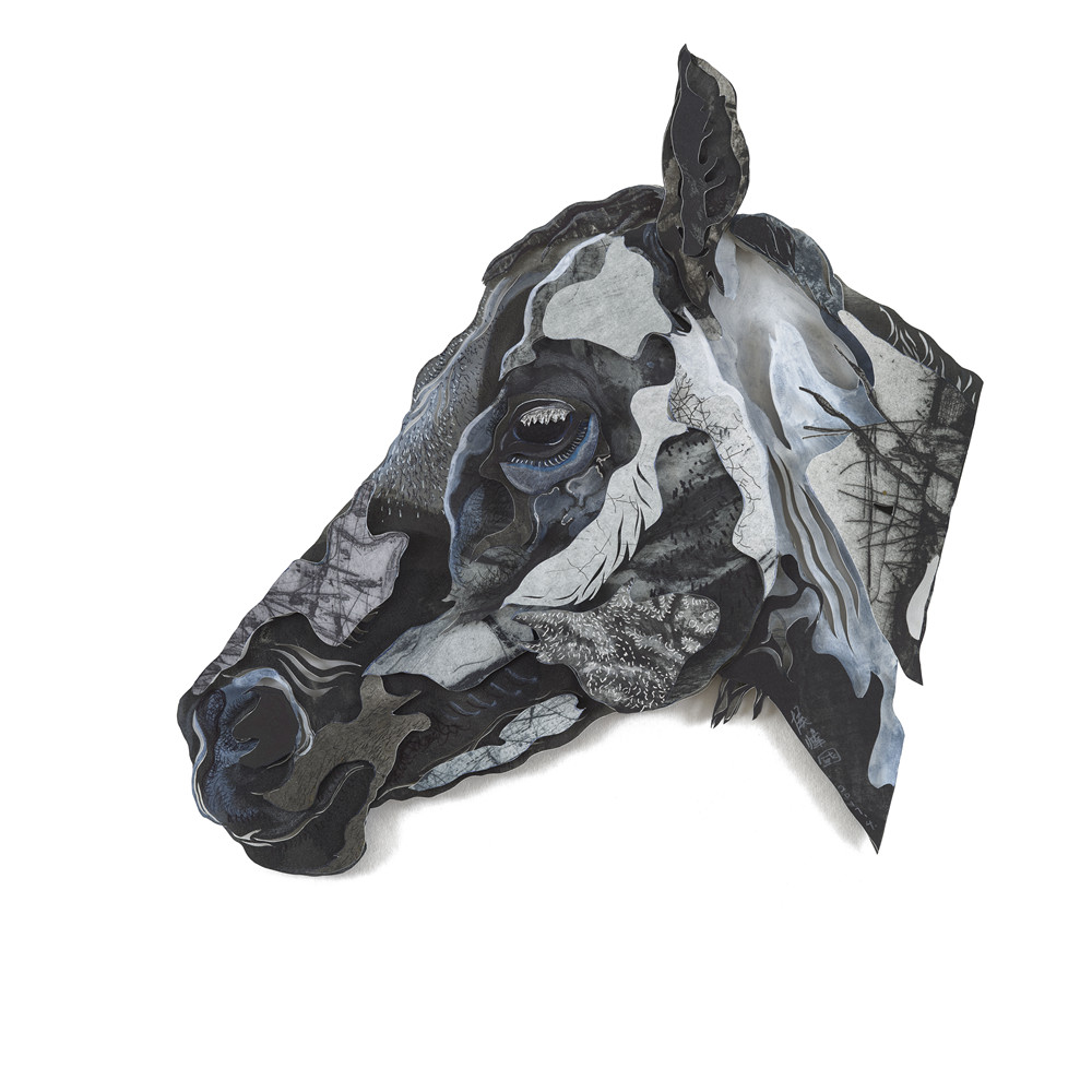 在侯炜国眼中,版画是拥有很多秘密的媒介材料,他从中发现了“版角料”,即版画里的试版和印坏的版画,将它们再次镂空、拼接、组合,形成新的具有版画印痕属性的“装置作品”。艺术家认为,“相马”的行为属性等同于 “相人”,他希望观者可以通过“相马”的过程,在人与马交流瞬间的静默中得以自观、内省。