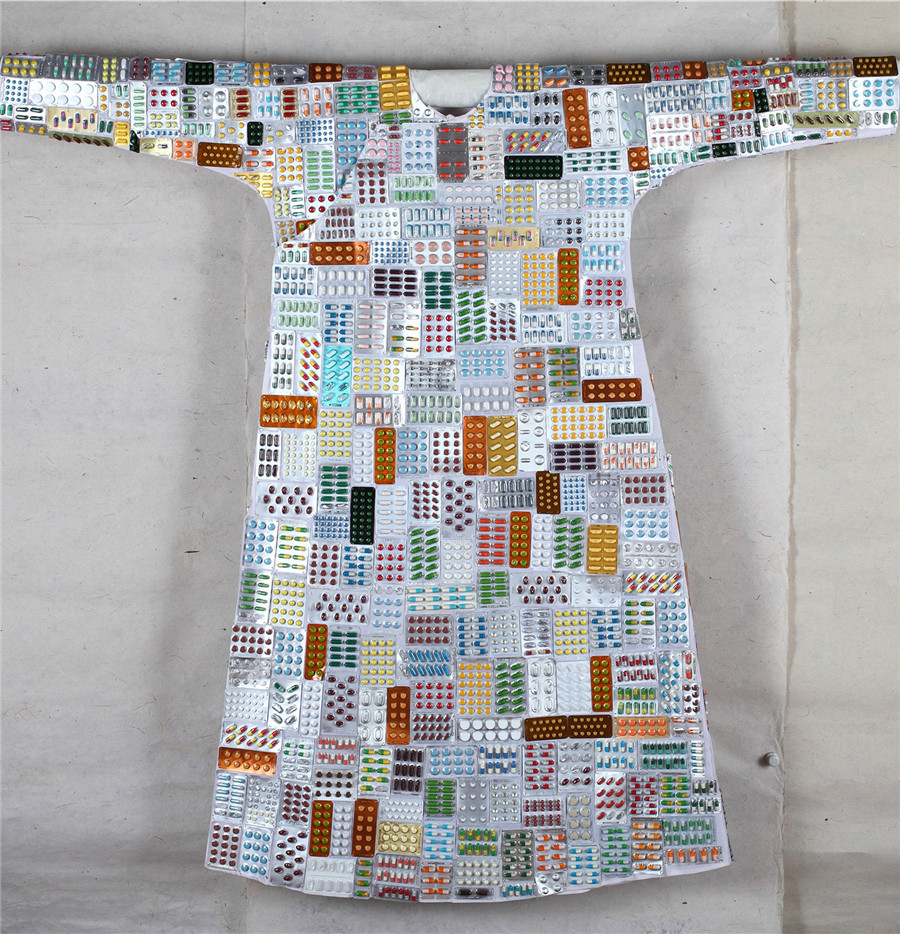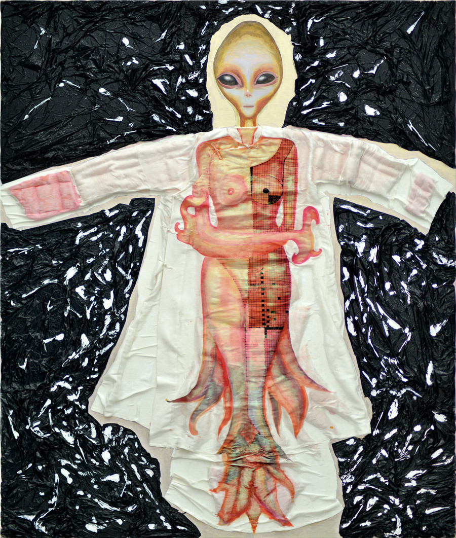 陈曦 异化 画布框 丝质衣袍 综合材料230x195cm 2017