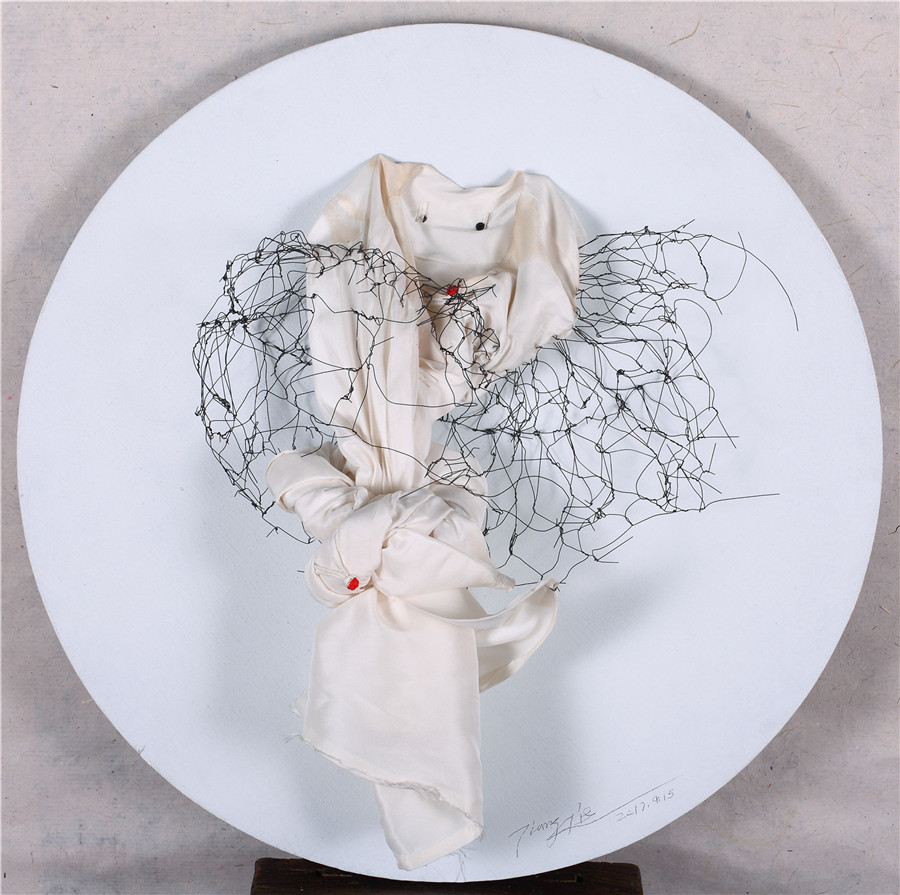 姜杰 宫 丝质衣袍 圆形画框 铁丝等综合材料80x80cm 2017