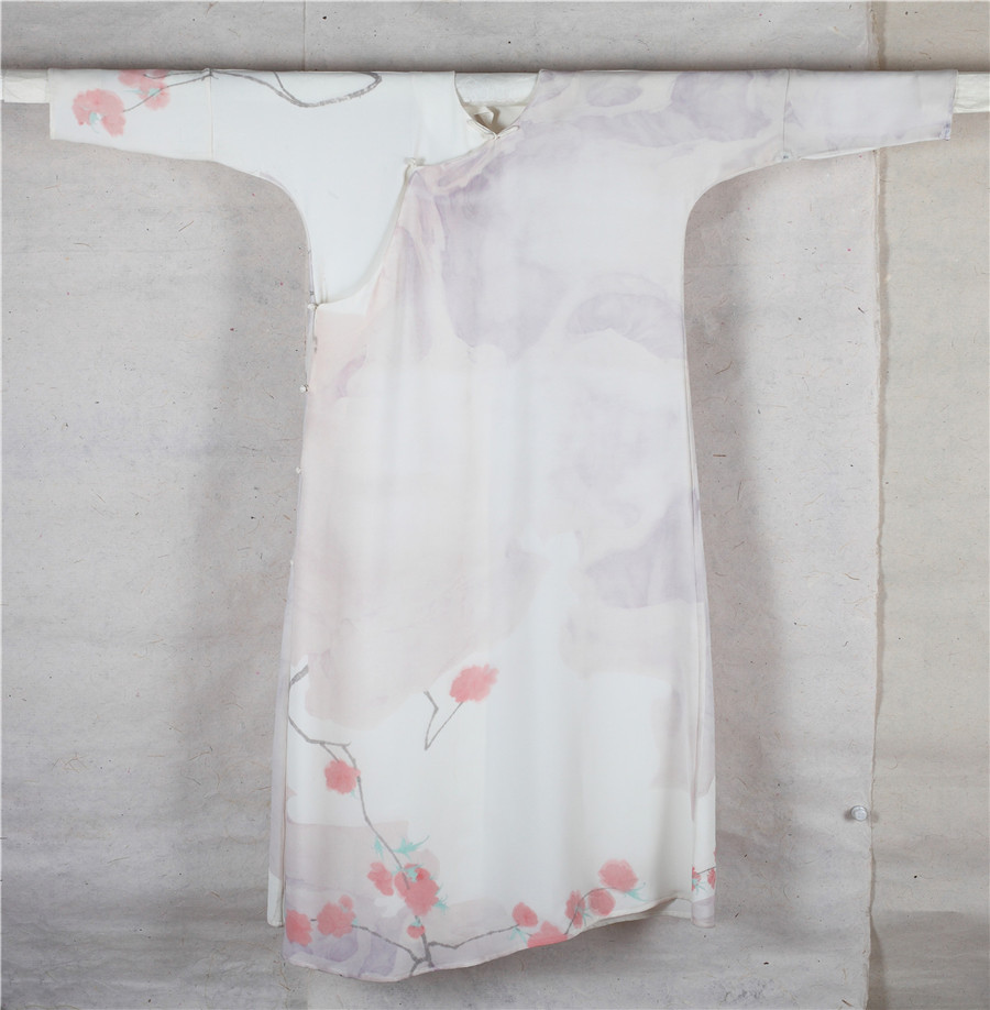 张见 山桃红 丝质衣袍 水墨设色 印染160x150cm 2017