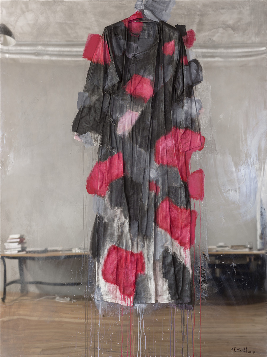 张晓刚 无题 丝质衣袍 镜面不锈钢 织物 丙烯 胶200x150cm 2017