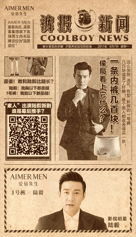 2017年8月,爱慕先生与著名影帝陆毅强强联手,重磅推出 “1号裤”陆毅限量新色!一向以“好男人”形象著称的陆毅,不单单有着符合广大女性审美的英俊外表,更加吸引观众的是,陆毅在生活中与在荧屏前塑造的他一样,有着敢于担当,充满正义的美好内在。爱慕先生之所以盛情邀请陆毅与联名新款“1号裤”,一方面源于他身上体现的 “好男人”品质与“1号裤”所打造的“好内裤”标准不谋而合,另一方面则来自品牌与消费者之间惺惺相惜的默契。对“1号裤”的广大受众来说,相比于光鲜的外表,精英男士们更在意优秀的内在品质;在爱慕先生眼里,消费者是了解品牌、喜爱品牌的知心朋友。此次与陆毅合作推出新款“1号裤”,爱慕先生希望用“1号裤”的好品质,加上符合品牌形象的明星影响力,为消费者提供一条好内裤,并让它去匹配更多好男人的内在。