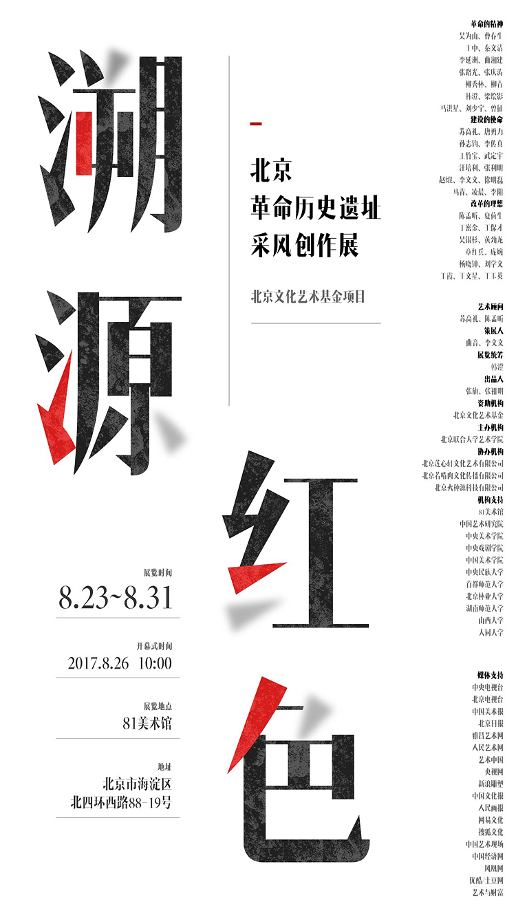 为贯彻落实习近平总书记在文艺工作座谈会、中国文联十大、中国作协九大开幕式和全国高校思想政治工作会议上的重要讲话精神,迎接党的十九大胜利召开,2017年8月,由北京文化艺术基金资助、北京联合大学艺术学院主办的“溯源红色——北京革命历史遗址采风创作展”在北京81美术馆顺利开展。这个项目是北京联合大学艺术学院坚持立德树人,把思政工作贯穿到教育教学全过程,扎实推进“课程思政”教育教学改革创新,为党和国家培养德艺双馨艺术人才的典型项目。