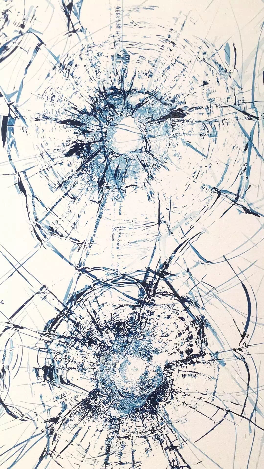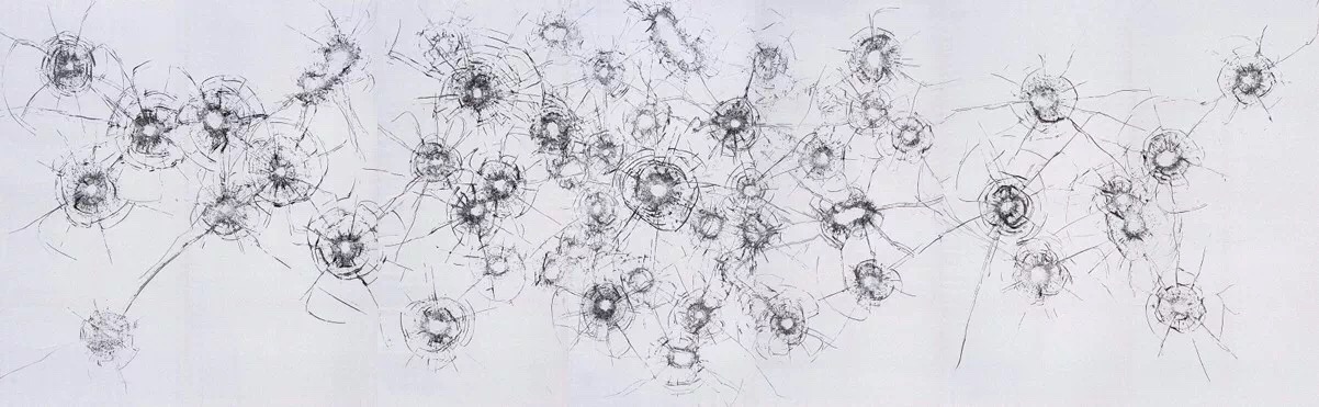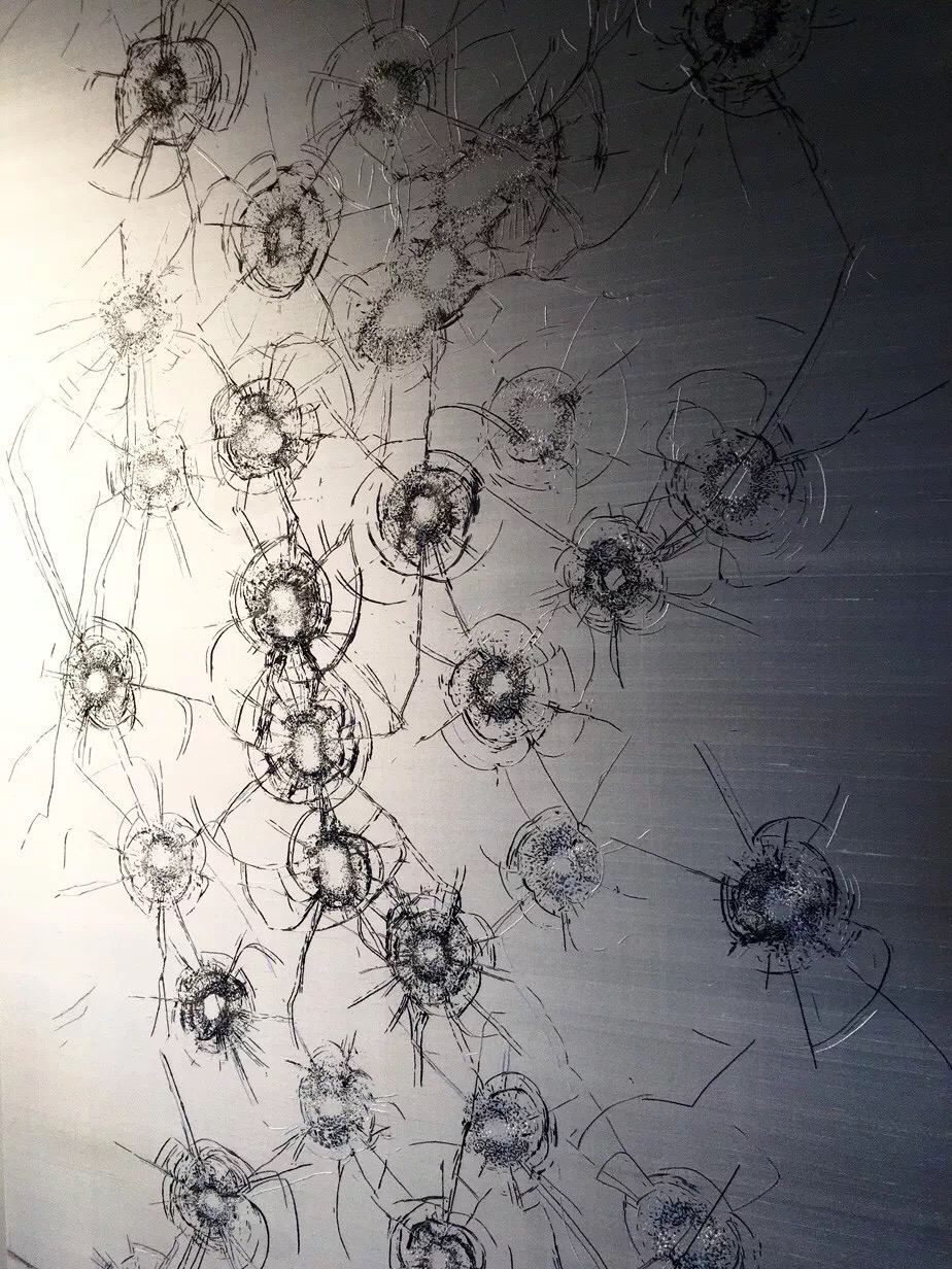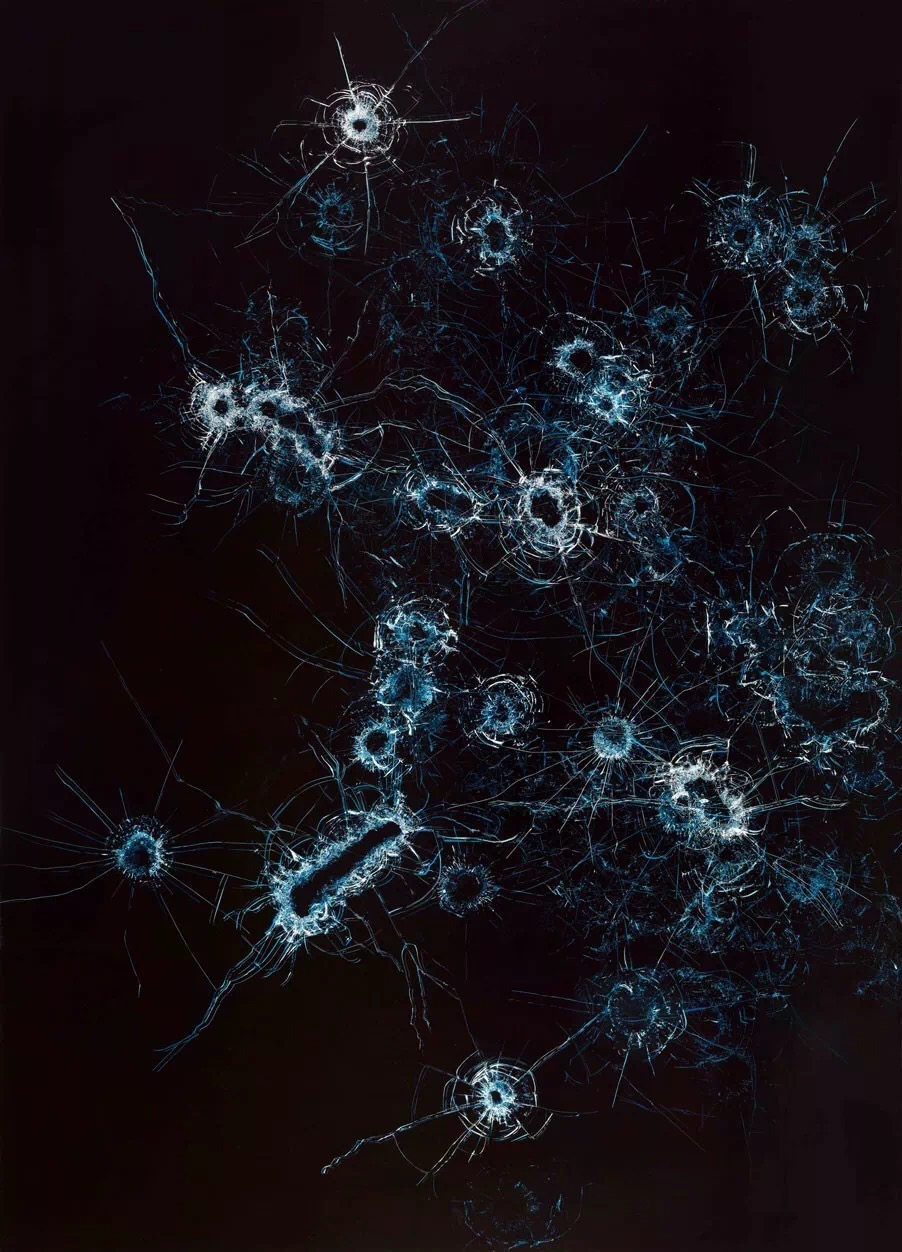 赵赵的作品从来都不是直接的视觉产物,而是在经历一系列事件后产生的对于现实的感知。在他的系列作品《星座》中,玻璃被子弹击中形成弹孔,裂纹以弹孔为中心向四周扩散,爆炸的能量瞬间发射出去并被无限放大。由此延伸出的《星空》系列,则以布面油画的形式重现玻璃被子弹穿透的瞬间。在《星座》与《星空》中,毁坏与重建的过程循环往复。