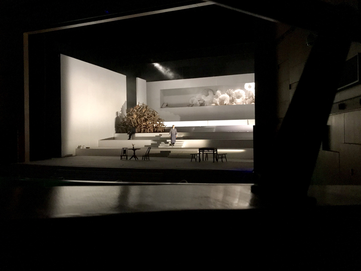 “白”在李六乙的作品中有深度掩埋感,覆盖感,覆灭感,灭失感,末世感,舞美由远及近的坡度,坡度和层层阶梯则有随时坍塌和沧桑巨变的极不稳定感,但是,这两个艺术家个人化的语言,似乎又是在一个梦境神话的苍穹之下,被罩盖,被护佑,而且由于被罩盖与护佑,则显得分外危机四伏,更令观众时时警觉那刻刻清冷,给人一种被逼着追问人生终极意义的惶恐。