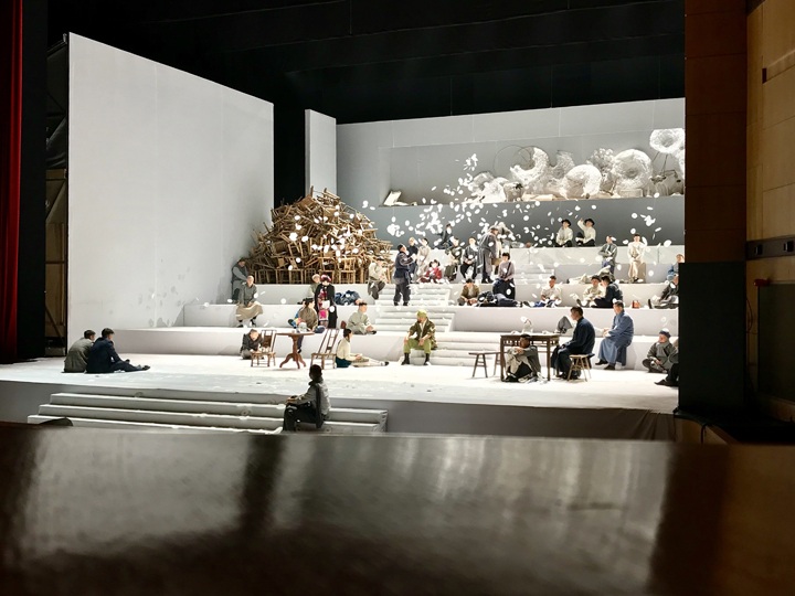或者是个金鱼缸,或者是个透明蓄水池。而由天及地的白和由远及近的坡度舞台,使我时时感到暗潮翻涌,感觉舞台之上随时会翻出一个巨浪,把舞台和所有观众转瞬吞没。李六乙的白是一种令人喉头紧锁,扼腕叹息的具有高度审美的白,这种白,这两大形式感从《安提戈涅》到《樱桃园》,再到四川方言版的《茶馆》。这种白和坡度,在茶馆这部作品中,无疑最与生俱来般贴切溶聚。