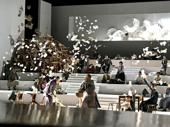 何为象?象者,像也。李六乙使用现实可触可感的物质白营造一种哲学的象,这象,包含他幼年时期随祖母在成都泡茶馆的濛濛追忆,包括“空的所指”,包括他人生经历中所知所感的自然界万物,包括虚构虚无的某些形象等等。象接近于名词,像接近于动词,介于有形无形之间,介于具象抽象之间,以鲜明形象表义理,这对于戏剧创作而言,作品中的情意表达需通过艺术形象,并且,所表达的情意与艺术形象不可分拆,艺术形象变,情意则变。所以,孔颖达曰:以物象明人事。