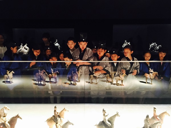 在震旦博物馆2楼陶俑展区,超萌导览员们跟随老师引导,细致观察展品。