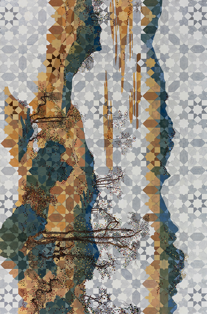 (横屏观看)丛云峰 Cong Yunfeng 太一的流溢-丁 Emanation of the One-Ding 90x180cm 木板坦培拉 Tempera on Wood 2017在《太一的流溢》系列中,丛云峰纯化了绘画的语言,他将“色彩化”和带有“平面感”的坦培拉绘画带入了“几何构造”的信息交换。波斯细密画的构图和植物纹样建立了一种空间句法,中国水墨中的山川意象被“跨媒介”的方式转化为经过“提炼”的平面化视觉语汇,山川获得了肌理、质感和颜色的属性,这是跨媒介转化和提炼所带来的微妙变化。丛云峰希望从普罗提诺的“流溢说”中获得启发,以几何为切入方式完成一共二十四件作品对应堪舆学的二十四山的二十四个方位,每个方式有其相应的五行、节气与卦象信息,他要让看似提炼和简洁纯粹的画面获得多重的意义阐释空间。例如他选择丙、午、丁这三件作品去对应芒种、夏至和小暑,也希望与中国传统文化中的卦位和五行形成一种符号与意义的多重关系,并由此确立画面的山水构成和色调选择。丛云峰要让这种“跨文化”的方式产生一种“流溢感”和“数据交换”的隐喻,密码由贯穿画面的“伊斯兰几何形”产生。他选择的八角形与八卦的“数字”吻合,在图像中位于中心的八角形被四周两层八个相同的八角形“环绕”,绘画产生了一种“隐藏结构”的阅读方式,由此产生一种“延展视觉”的图像基础,获得太一流溢的感觉。在这些充满“数理暗示”的语法中,山川的“平远”与几何的横向移动产生了图像的“左右运行”的异次空间,同样“高远式”的高山与几何的“云雾式存在”将视觉引向“上下运行”的动态,而“深远式”的山体在几何的作用下产生“由近及远”的纵深运行,这一切都由“几何”及其所指代的“数理”和“宗教”含义而被重构为“语境化”的图像模式。这是一种与几何和数理相关的“交感幻觉”,也是和这个时代的“思维结构”发生内在转化的方法。在这个系列中,几何的“数理属性”和“宗教含义”让丛云峰的绘画朝向完成“代码转向”只差一步之遥。