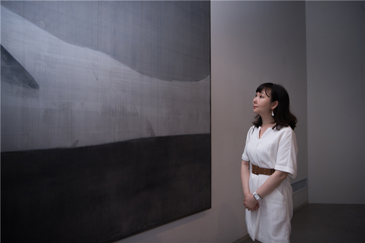 展览现场在曹吉冈学习和创作生涯的主要时期,中国画坛以现实主义风格为主导,而曹吉冈却反其道而行之,其作品一直有意与现实保持距离。近年作品更逐渐脱离主题、叙事,趋于抽象。中国传统水墨原本有现代抽象的形式元素,而西方的抽象主义绘画,特别是极简的冷抽象,也受到东方禅宗的影响。艺术家从强大的传统山水中取极少的因素融进风景,从而生成不同于两者的叠加态。这种叠加态是西洋画法的坚固性与传统水墨的流动性之间的一种平衡,具有文化识别上的模糊性。这种模糊性比确定性打开了更大的思维与想象的空间。观者不必用固有的西画或国画的概念来定位其作品——它只是两种表达方法、两种艺术趣味混生而成的另外一种画面的呈现。曹吉冈的作品跨越中西绘画之界限,以近抽象的巨幅画面表现“崇高”之精神境界,这种崇高不是人对于自然的敬畏或征服,而是人与自然的共融和共存,在看似冷漠的风景中折射出恒古持久的人文关照。