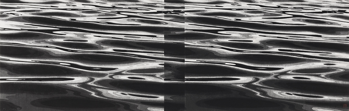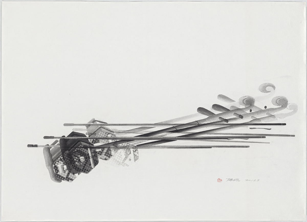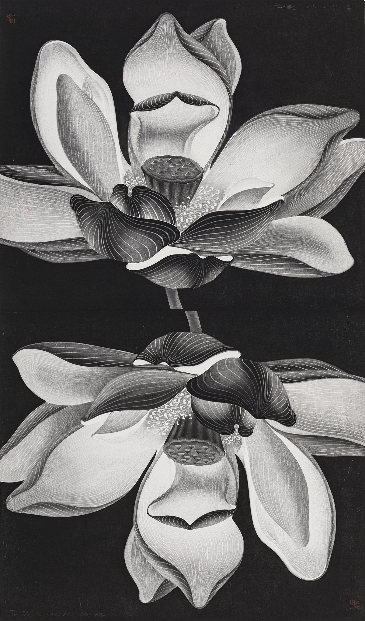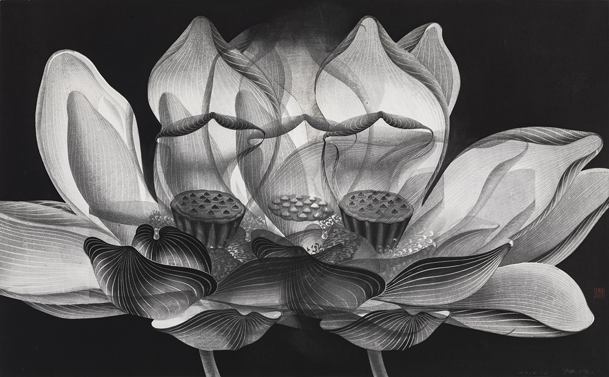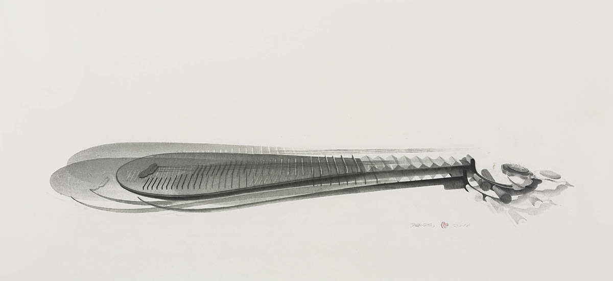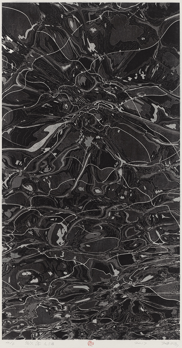 从2015年始,我以20年前《琴》、《明式》、《荷》、《阐释》等作品的旧印版做了一系列实验性独幅版画作品。唯一目的就是希翼在印痕与复数这两个版画本体最基本概念上寻求突破与超越。实验打破了印版原有套印次序,印版不再依原先设定好的次序按部就班套印,而是根据印版自身图形结构形态自然生发的意象,即兴发挥,自由印制。如此,印版便由过去单纯的形象再现功能中解放出来而彰显其存在的价值和意义。与此同时,这样的实验性作品也消解了版画机械性复数,使每张版画都具有独一无二的印痕和精神禀赋。
