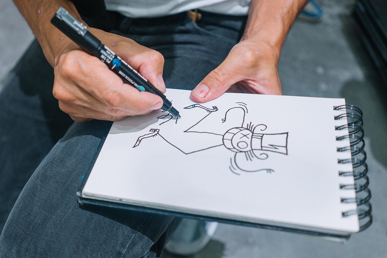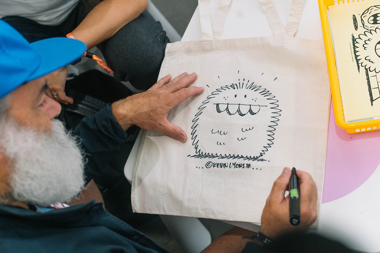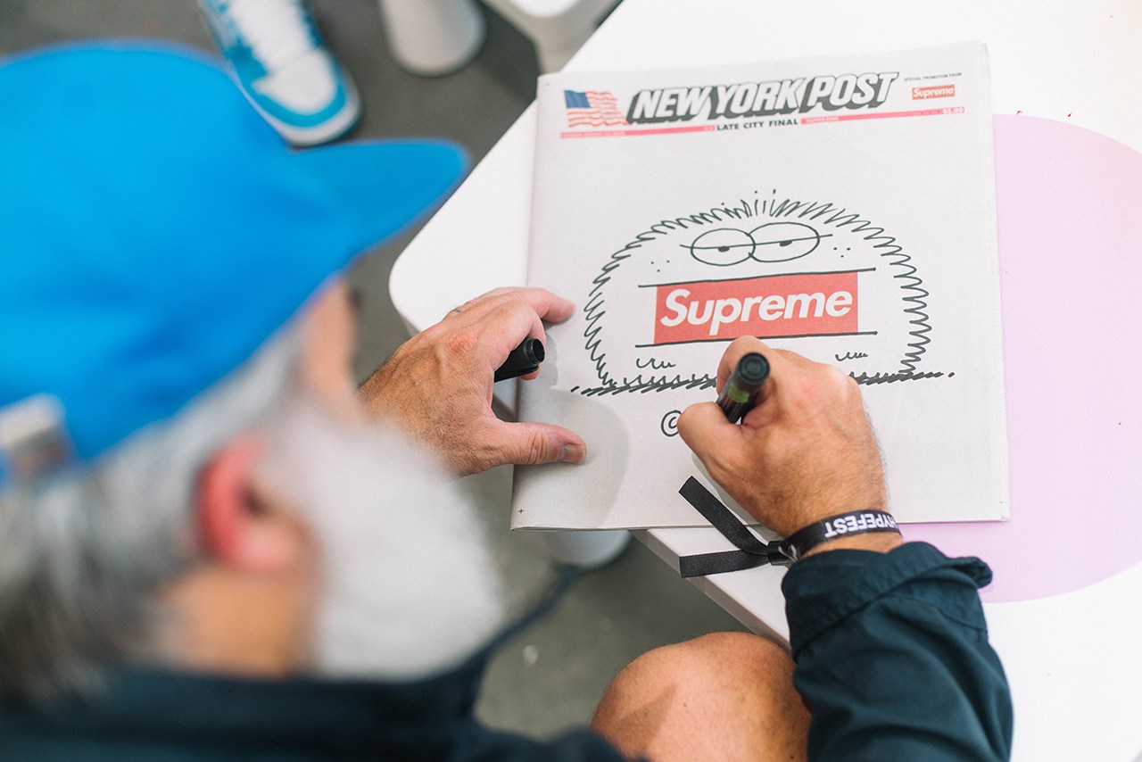 在刚刚过去的 HYPEFEST 周末上,fragment design 与《POKÉMON GO》联名系列以及 Off-White™ x RIMOWA 第二波行李箱一齐亮相,引起不少关注。除了现场独占和首发的单品外,HYPEFEST 也举办了各式艺术创作活动,参与者包括涂鸦艺术家 Futura、André Saraiva、Stash 以及设计师 Kevin Lyons。Futura 和 Andre 也合作了一个壁画项目,在一个由多块画板组成的作品中,进行了关于 Monsieur A. 与 Futura 标志性原子旋涡图案的绘制。现场的绘画活动开始于涂鸦艺术家 Stash 完成了他的作品之后,三位艺术家共同为活动参与者的衣物绘制客制图案,并画了大量的个性化手稿。与此同时,Lyons 也主持了一个面对儿童的绘画活动,父母与孩子可以在艺术家创作的图案上进行上色,Lyons 则为他们签名以及进行一些即兴的涂鸦,其中也有 Supreme 登上《New York Post》的封面图。