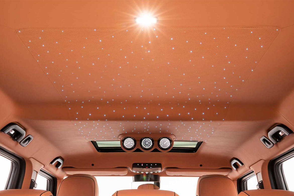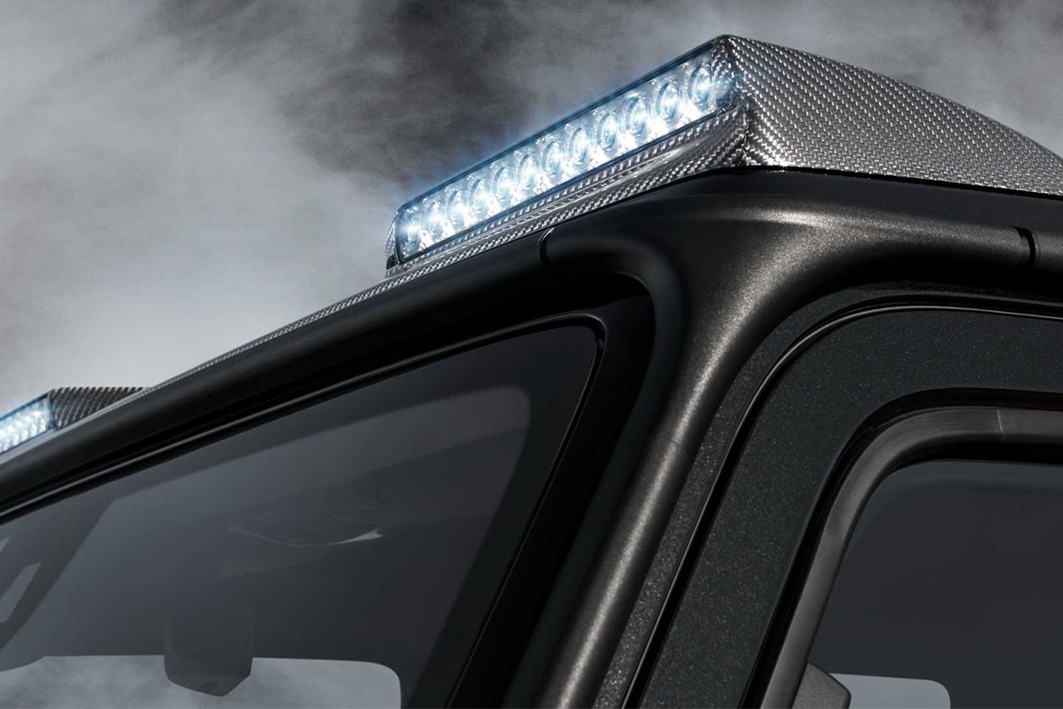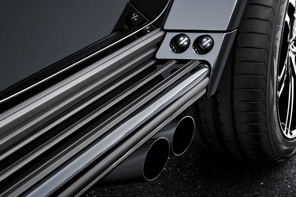 全车换上定制宽体套件,车身宽度增加约 4 英寸,为 23 英寸大尺寸合金轮匡提供足够空间(亦可选购小尺寸轮匡),加大的进气口则为引擎提供足够空气,引擎盖上的碳纤维质料 Power Bulge 更彰显不凡身份,车尾处的备用轮胎罩亦运用大量碳纤维打造,并在车顶、挡泥板处配置 LED 灯辅助照明。