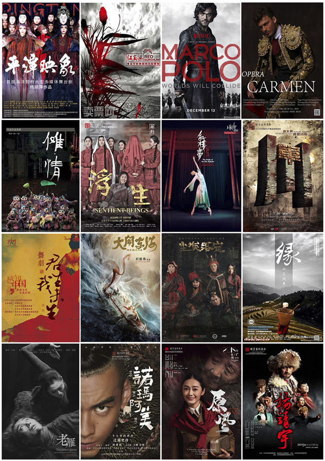 舞剧《诺玛阿美》《红高粱》《尘埃落定》《雪域天路》《杨靖宇》《打金枝》《原风》《永远的秧歌》《傩情》《浮生》 香港芭蕾舞剧《红楼梦》 音乐剧《我是川军》 杨丽萍舞台秀《平潭映象》万达西双版纳冰秀《蝴蝶公主》 合肥万达秀《谍影虫虫》 深圳东部华侨城《天禅第二部》《独山盛典》《敦煌盛典》等
