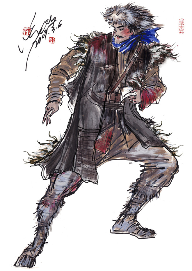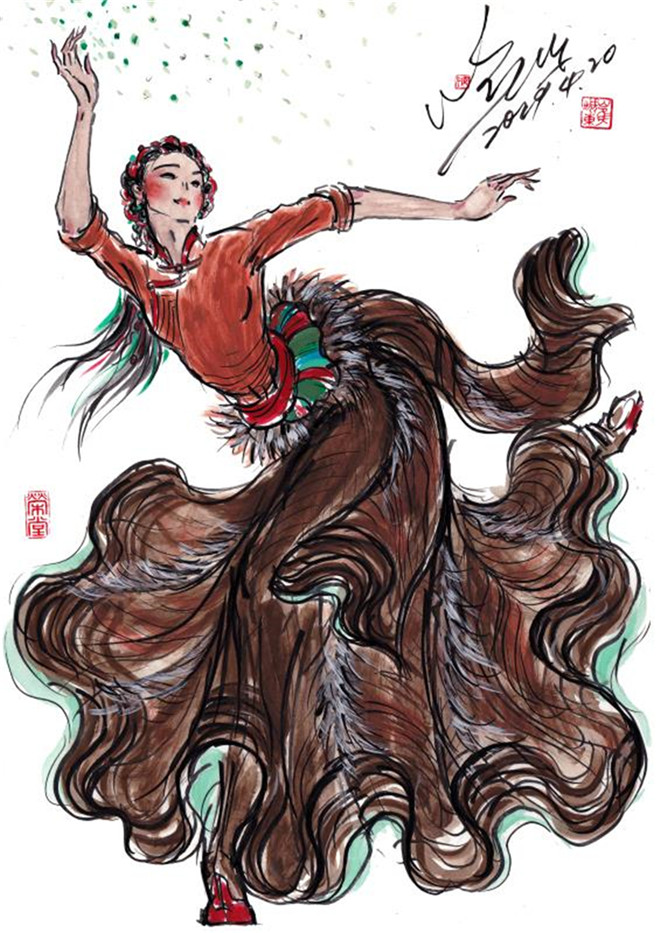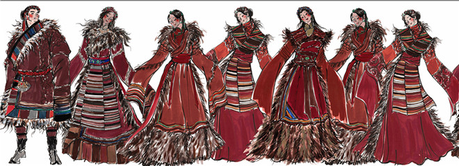 舞剧《雪域天路》在服装色彩关系呈现上,利用大色调统一处理人物关系,表达人物的内在情绪。如何用艺术的手段处理,使之源于生活并高于生活,同时要与之前的服装语境相融合,成为了舞剧的一大难点,几稿设计图经过不停地比对、总结,最终巧妙地解决了这个问题。在服装款式处理上,既要尊重时代特色,结合舞剧特点和人物性格特点,又要结合当代艺术的审美要求。面料以棉麻为主,几乎所有的面料都经过染色、面料再处理,通过不同的手法处理肌理的走向、形状、面积、规则程度等因素,将一件件服装排列组合,组成表达戏剧情境的载体。