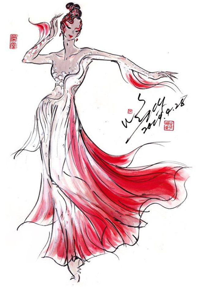 舞剧《诺玛阿美》手稿的设计沿用于传统的手绘,每一笔都是设计师想象力的完美呈现。丢掉冰冷的机器,坚持手绘只因可以令实物更贴近设计的初衷。从设计稿出炉的那一刻起一切的工作才刚刚开始,以哈尼族特有的梯田文化,构思人工造就独一无二的布,使每一件衣服都有自己独有的肌理,呈现出油画般的质感。