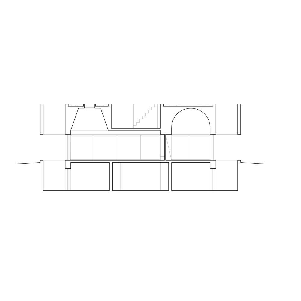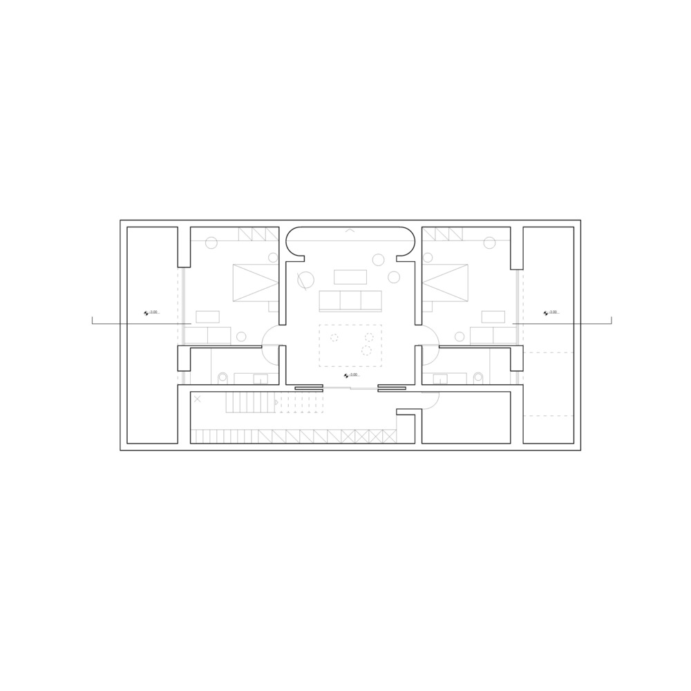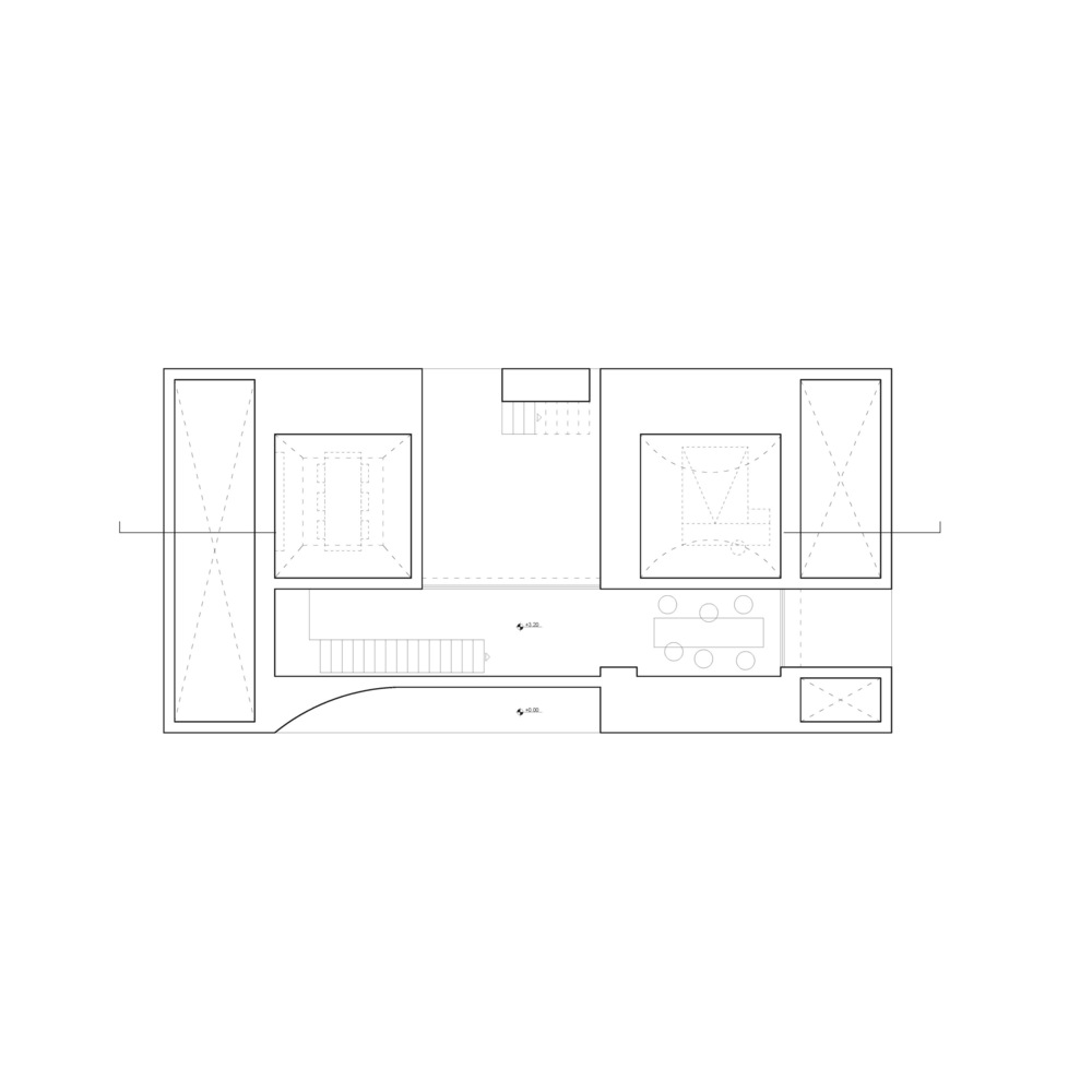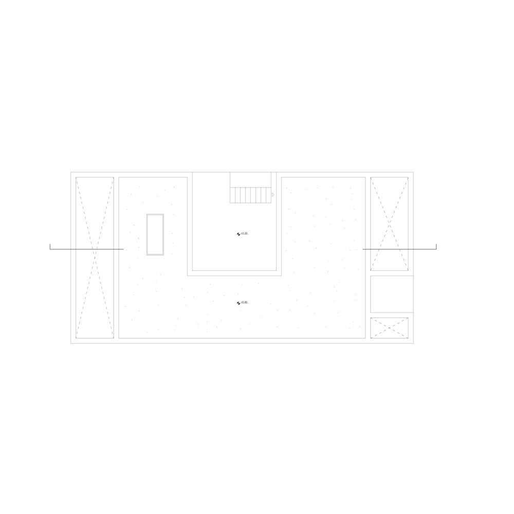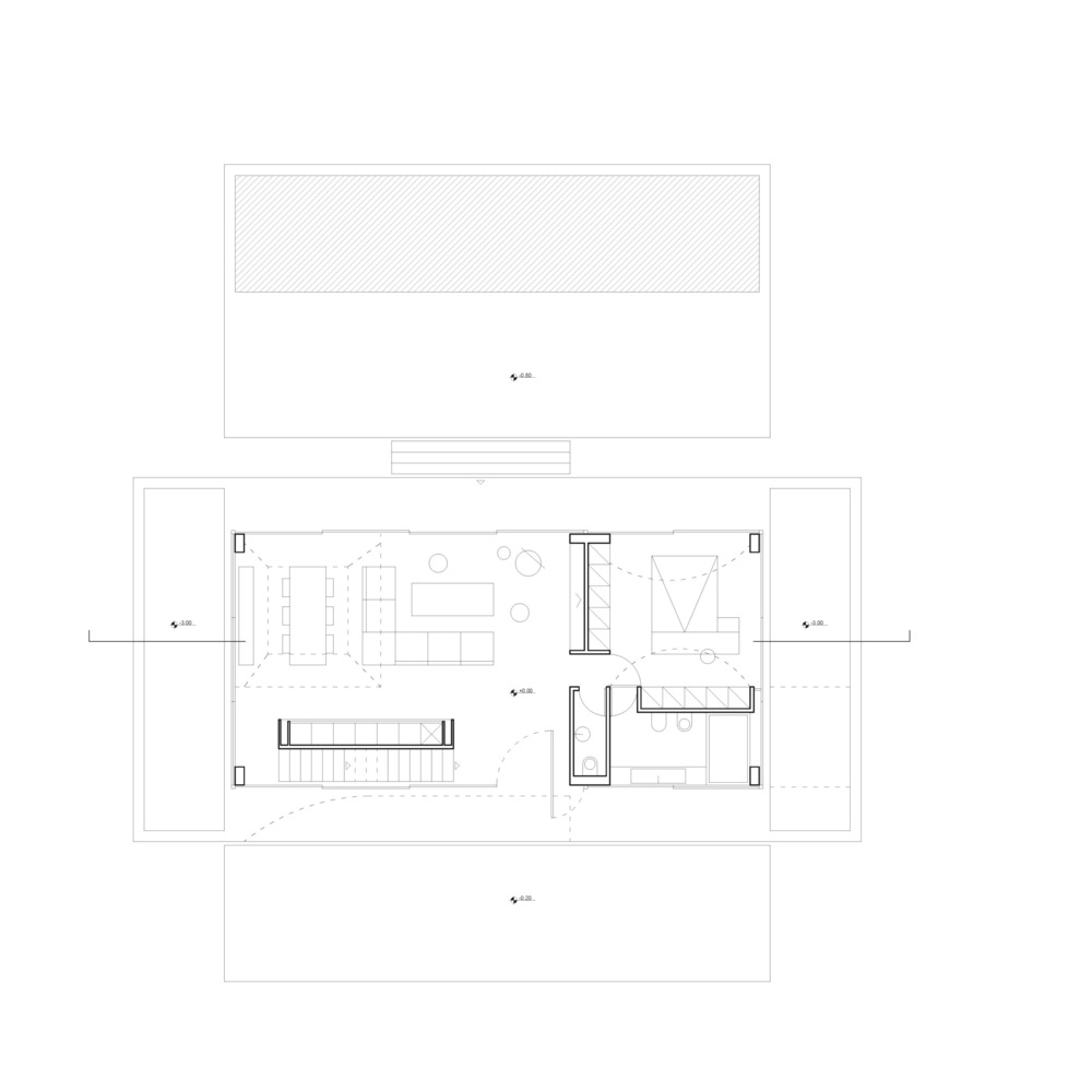 底层位于高架屋顶下面,由开放式的坐位、餐厅和厨房空间、主卧、浴室和卫生间组成。屋顶比地面高3.2米,形成了一个带办公室的阁楼。主入口位于西侧,东边是通往阁楼和地下室的通道。一个细长条的游泳池与室外的客厅庭院融合在一起。