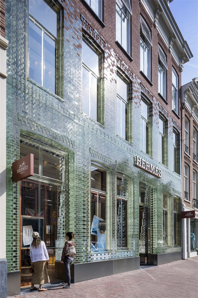 正如合作团队所解释的那样,“由于香奈儿临时商店的空间需求,这种透明度已经被一层玻璃幕墙上部后面的一堵无窗墙削弱了。“新爱马仕商店的室内设计师 Bureau de Binnenstad 拆除了这堵墙,并开放了楼层,让人们第一次看到具有特写效果的玻璃与砖块相融合的效果,充分展示了设计的透明性。