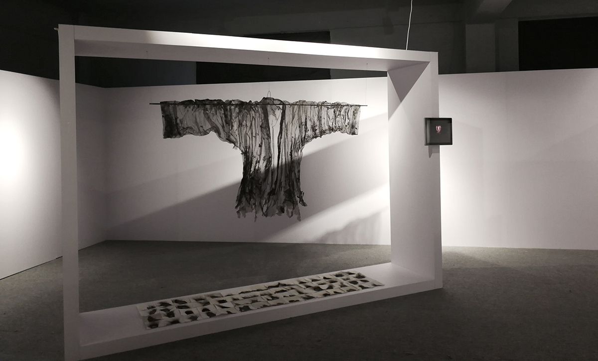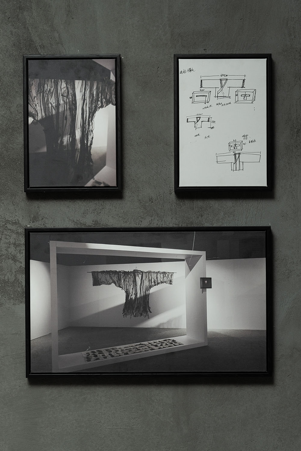 多媒体艺术装置《无问.襌衣》分为实物和视频两部分,视频记录了作品的成形过程,金属网与天然苎麻的贴合制成《无问.襌衣》雏形,经过长期的风吹日晒,最后燃尽,表面的苎麻燃至灰烬,与内在的金属网衣组合出另一种全新的状态。