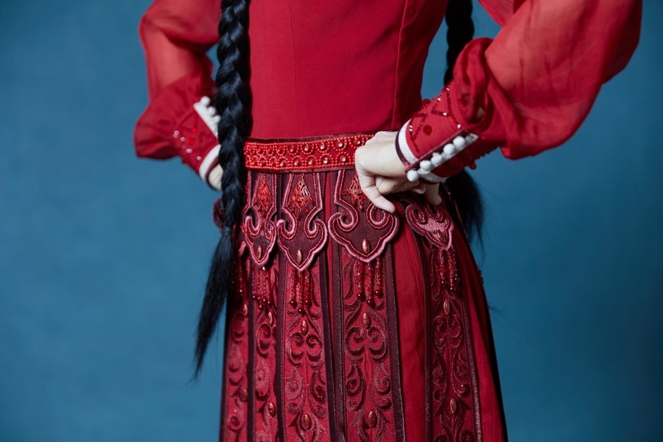 这次的服装创作,我们注意到和传统色彩缤纷多彩的民族服装不一样,相对简洁而高雅。阳东霖表示:“我们在设计上还做了很多的过滤,保留新疆原有的元素。颜色上的选择,让我们能够通过最纯粹的方式表达浓烈的情感。在丫丫的服装设计上,我们也舍弃了主角的繁重,选择了很多轻一些的面料,也减少了舞蹈上的负担,让她可以挥洒自如。虽然简化,但我们仍然在服装上保留了这片土地上最强烈的文化符号,每一个花纹都是对新疆文化最细腻的讲述,每一次裙摆飞舞都是对家乡故土最深情的告白。”