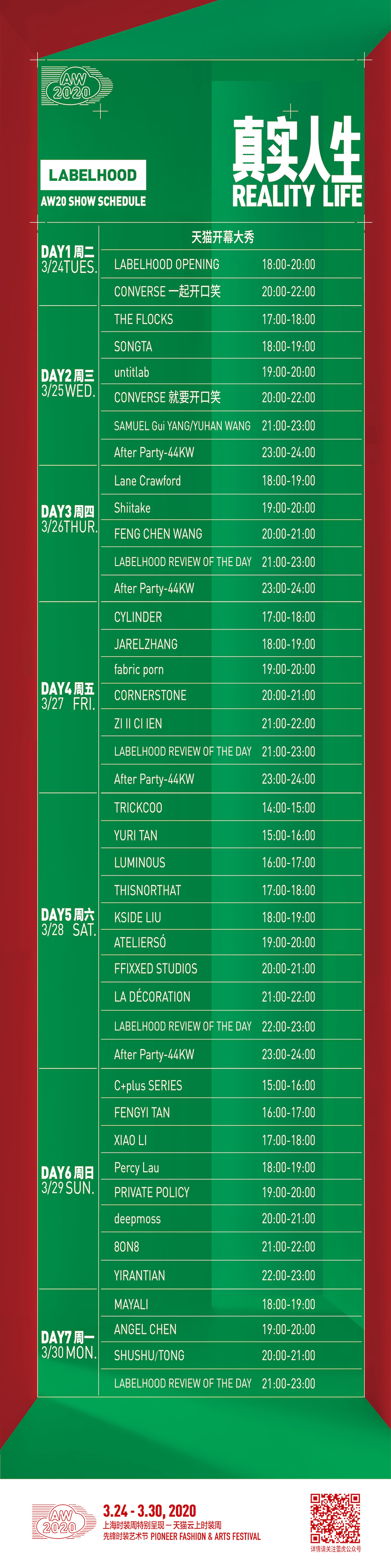 2020 年 3 月 24 日至 3 月 30 日,新一季 LABELHOOD 蕾虎先锋时装艺术节将突破传统线下新品发布秀,登陆上海时装周与天猫共同打造的全球首个「云上时装周」。LABELHOOD 将以「真实人生」为主题,探讨生活中虚拟世界和真实生活的模糊界限。本季加入的设计师们也将各自对社会与未来的无限畅想呈现于设计中,从不同维度彰显来自中国的时装态度。