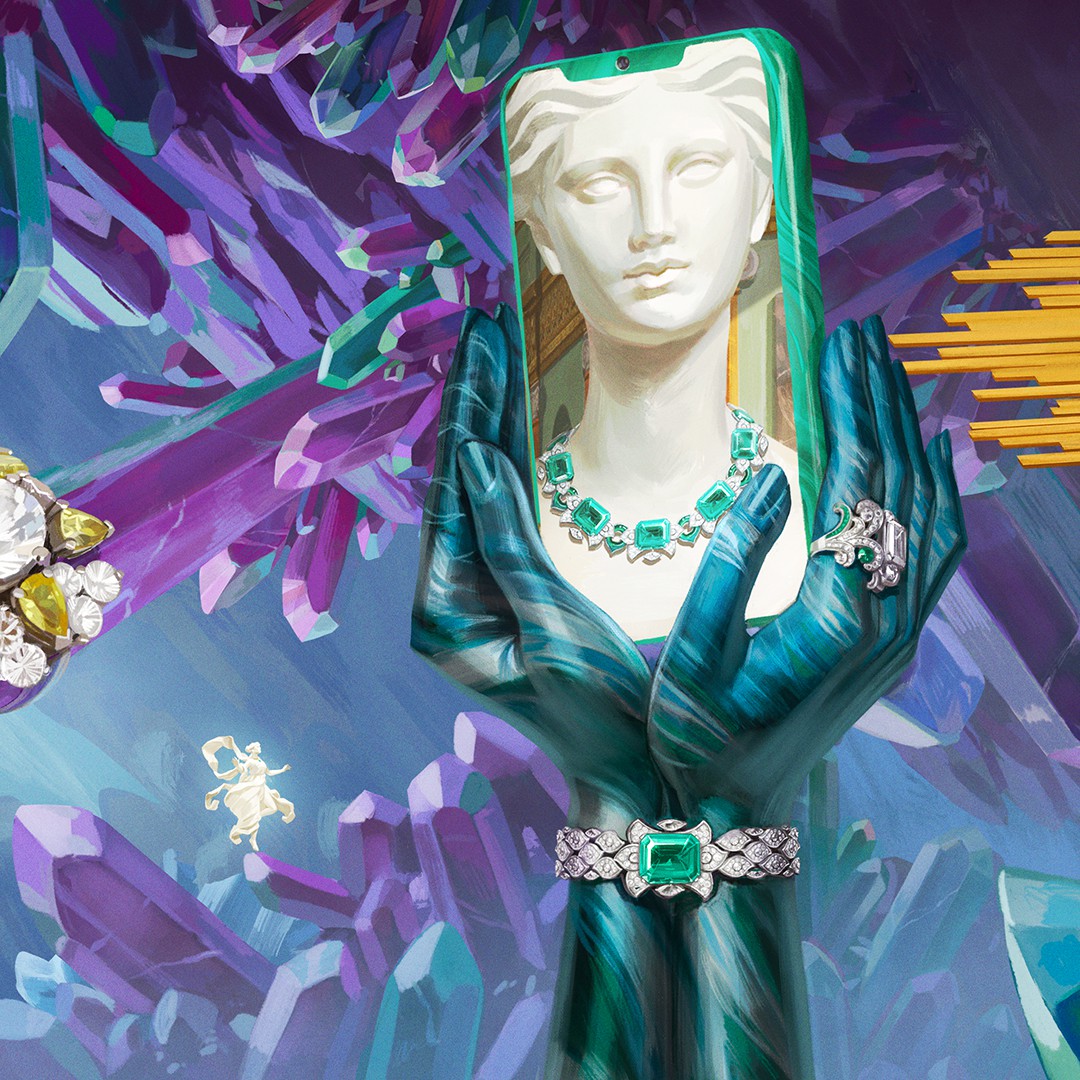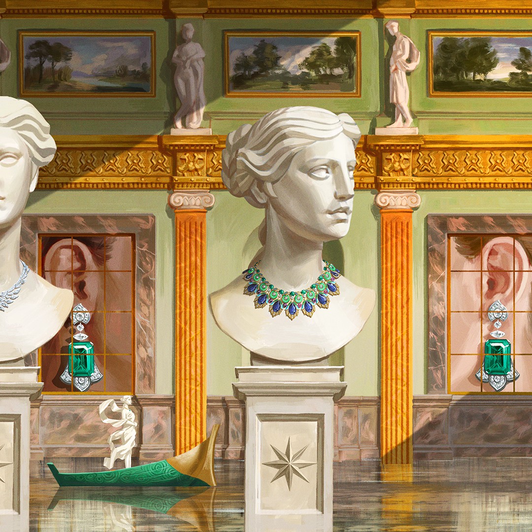 同样作为巴洛克艺术风格的瑰宝,由弗朗切斯科·博罗米尼修建的罗马圣依华堂,其教堂处微凹的穹顶设计,给予了系列滴翠星辉(Emerald Star)项链几何结构以启发。密镶钻石的线条形成了恰似起伏跌宕的波纹,效仿穹顶精妙的结构。而选用的赞比亚祖母绿珠粒与莹润的珍珠交相辉映,在工艺大师 900 多个工时的创作中,将体积和比例调整到最佳的状态。