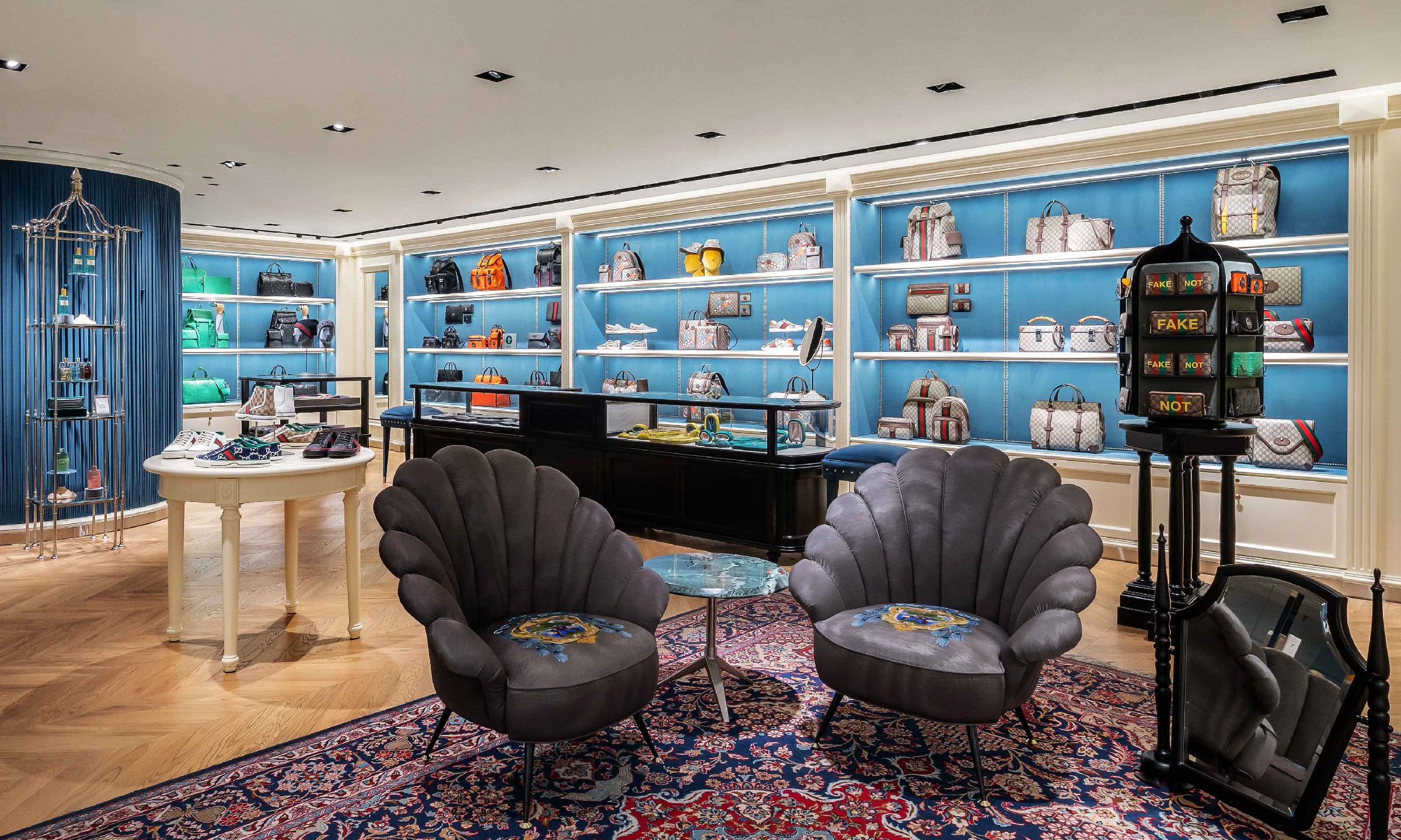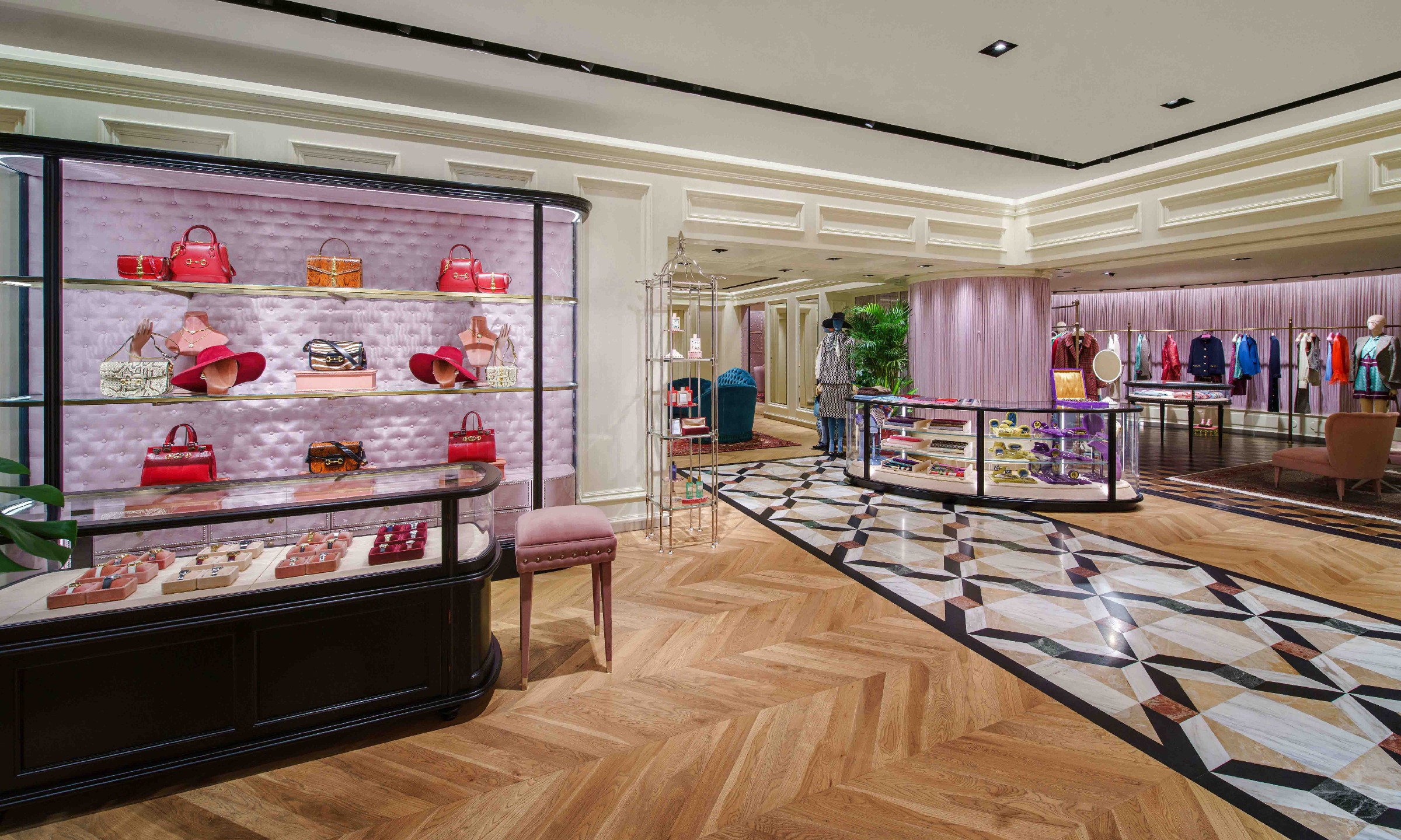结合传统与现代审美,全新店铺设计由深入 GUCCI 的当代美学创作延展开来,并融合了浪漫主义与工业设计元素,呼应兼收并蓄的品牌视野。空间的当代奢华理念不仅是透过精致的异材质形塑层次美学,也借由对于店铺空间的独特运用构建视觉美感。