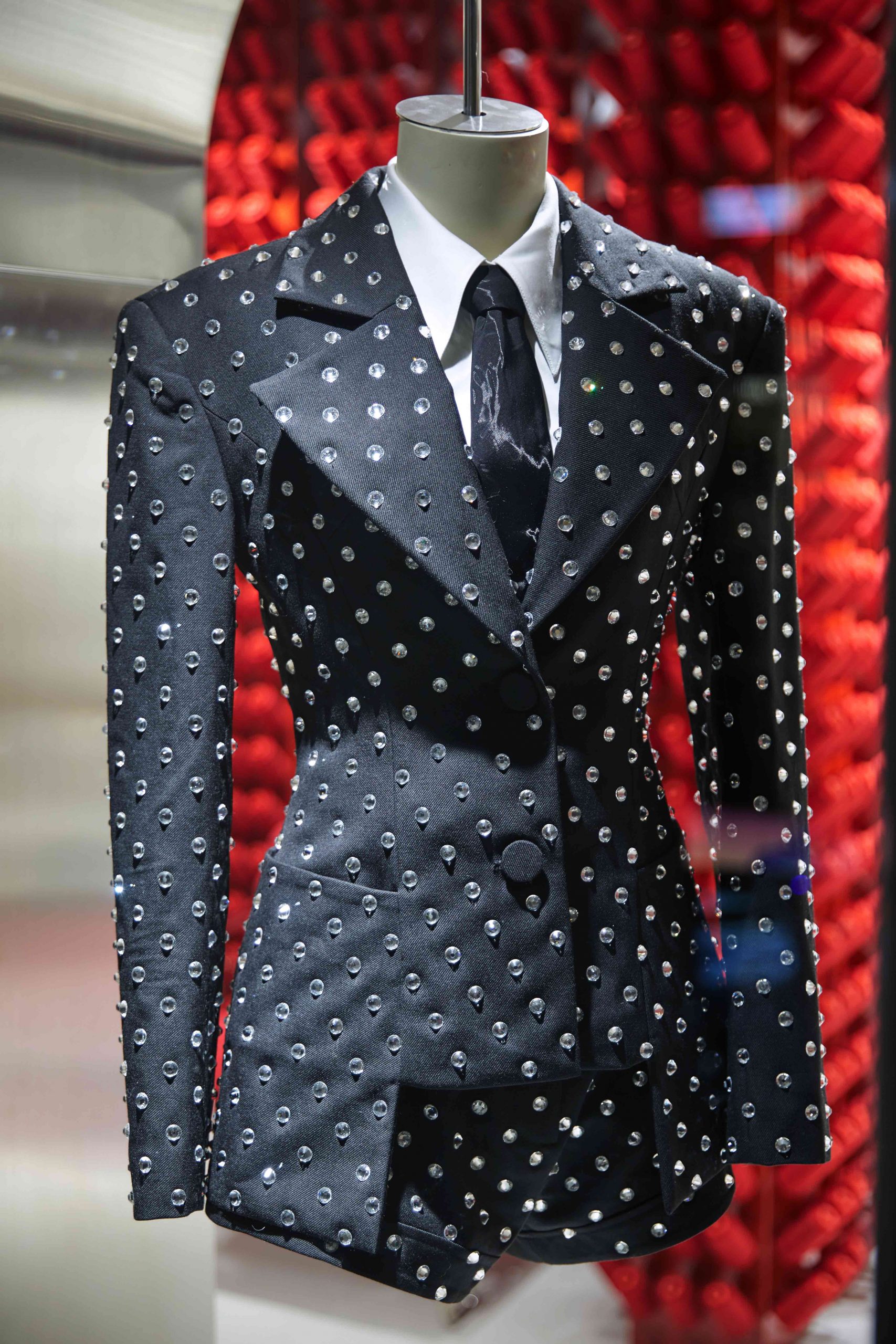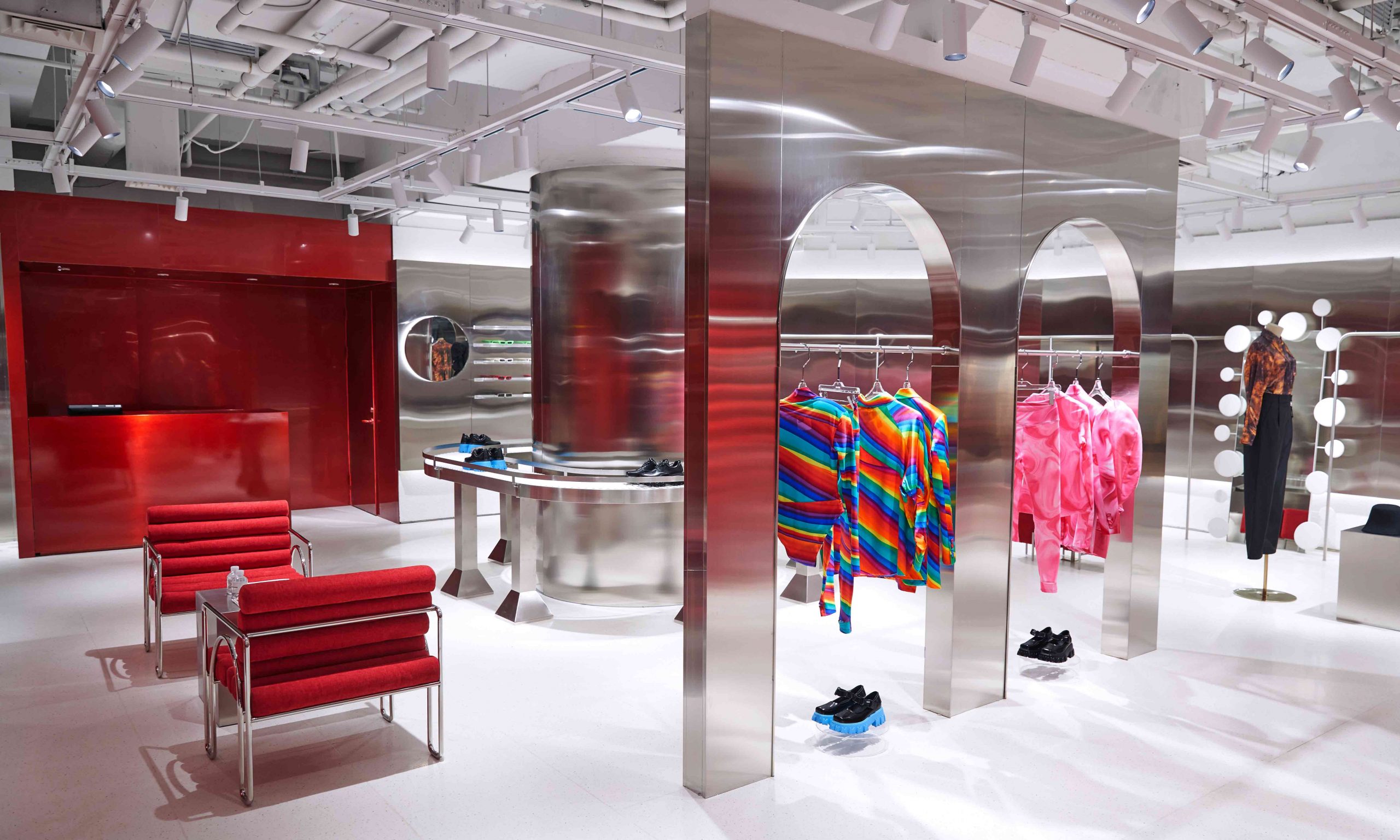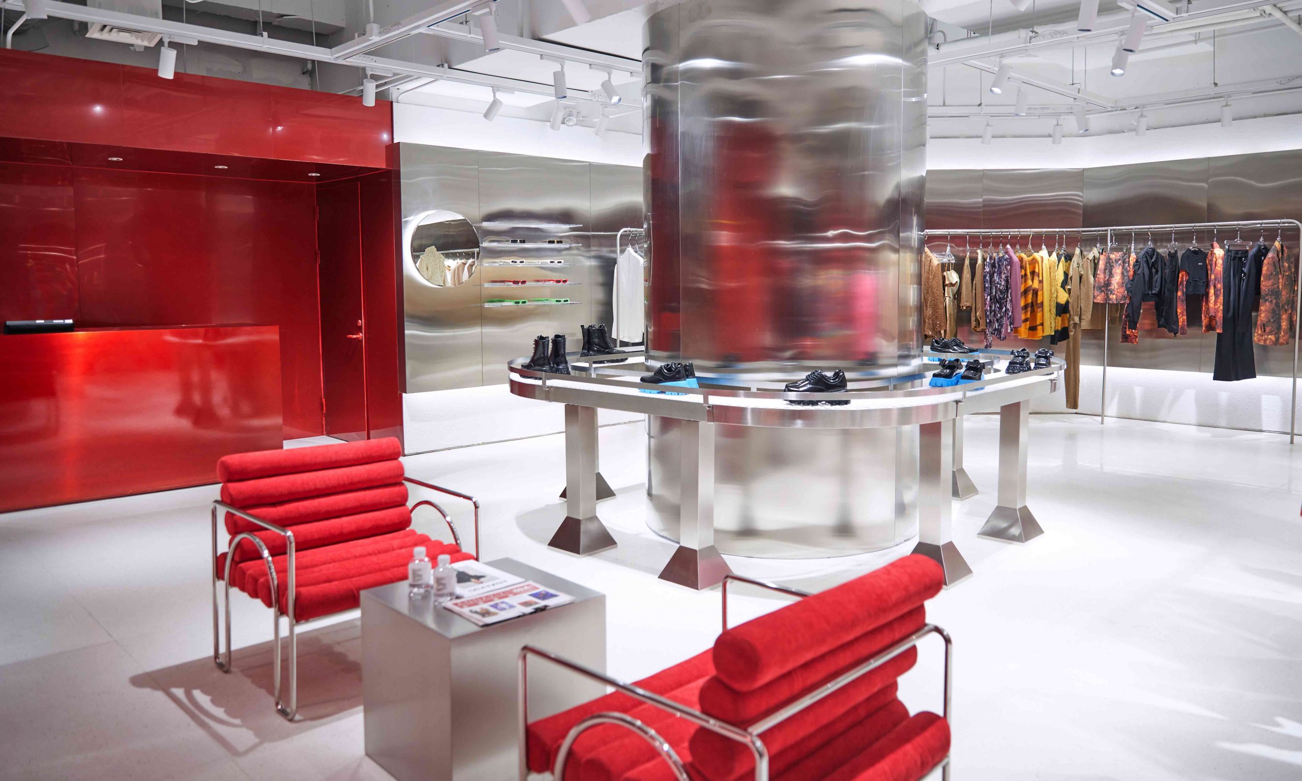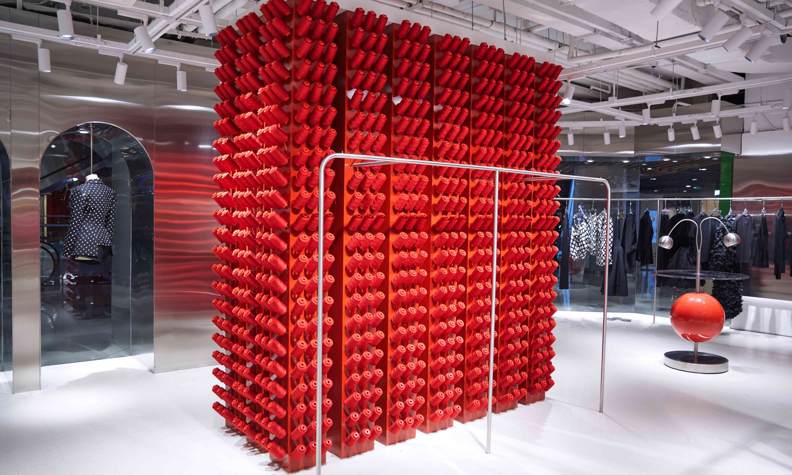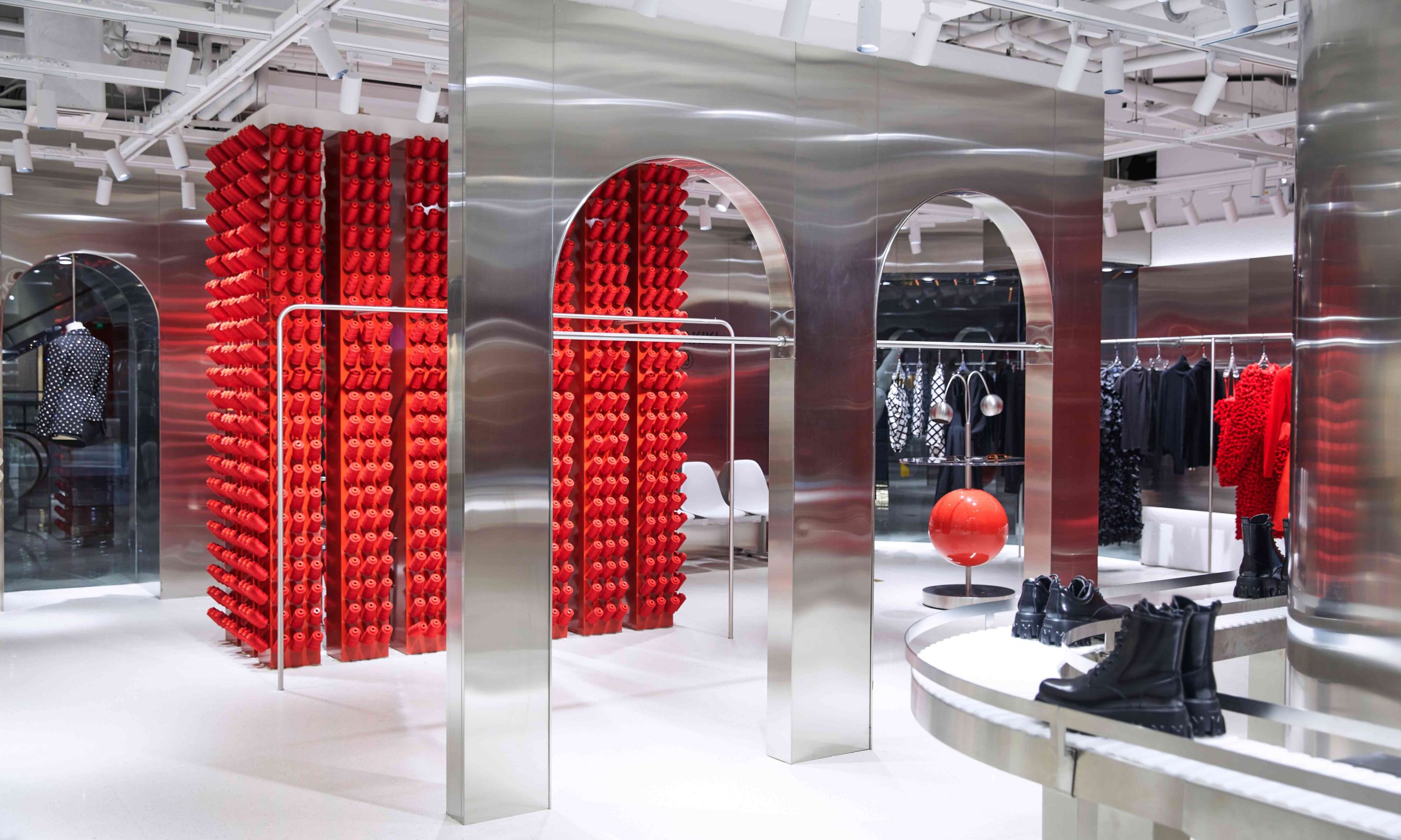 此次与公众见面的 ANNAKIKI 全新店铺打造了一个艺术空间,将「Red Thread」线轴装置作为核心,让不同色彩与材质之间产生奇妙的碰撞。大面积红色和银色金属材质的应用,在克制与叛逆之间达到了巧妙的平衡。异想天开的组合打破了固有的思维限制,构建起充满科技未来感和超现实主义风格的艺术空间,完美演绎了鲜明的品牌个性。店内展示的 ANNAKIKI 2021 春夏系列新品吸引了到场嘉宾驻足欣赏。这组名为「COSMIC SIGNAL/时空信号」的作品,灵感来源于人类对未知宇宙的幻想和探索。生活在这颗孤单的星球上,人类探索宇宙的渴望从未停止,从天文望远镜到脉冲信号再到航天器,都是人类从脚下的土地向浩瀚无垠的未知迈出的步伐。ANNAKIKI 用时装设计语言演绎了这一浪漫幻想。