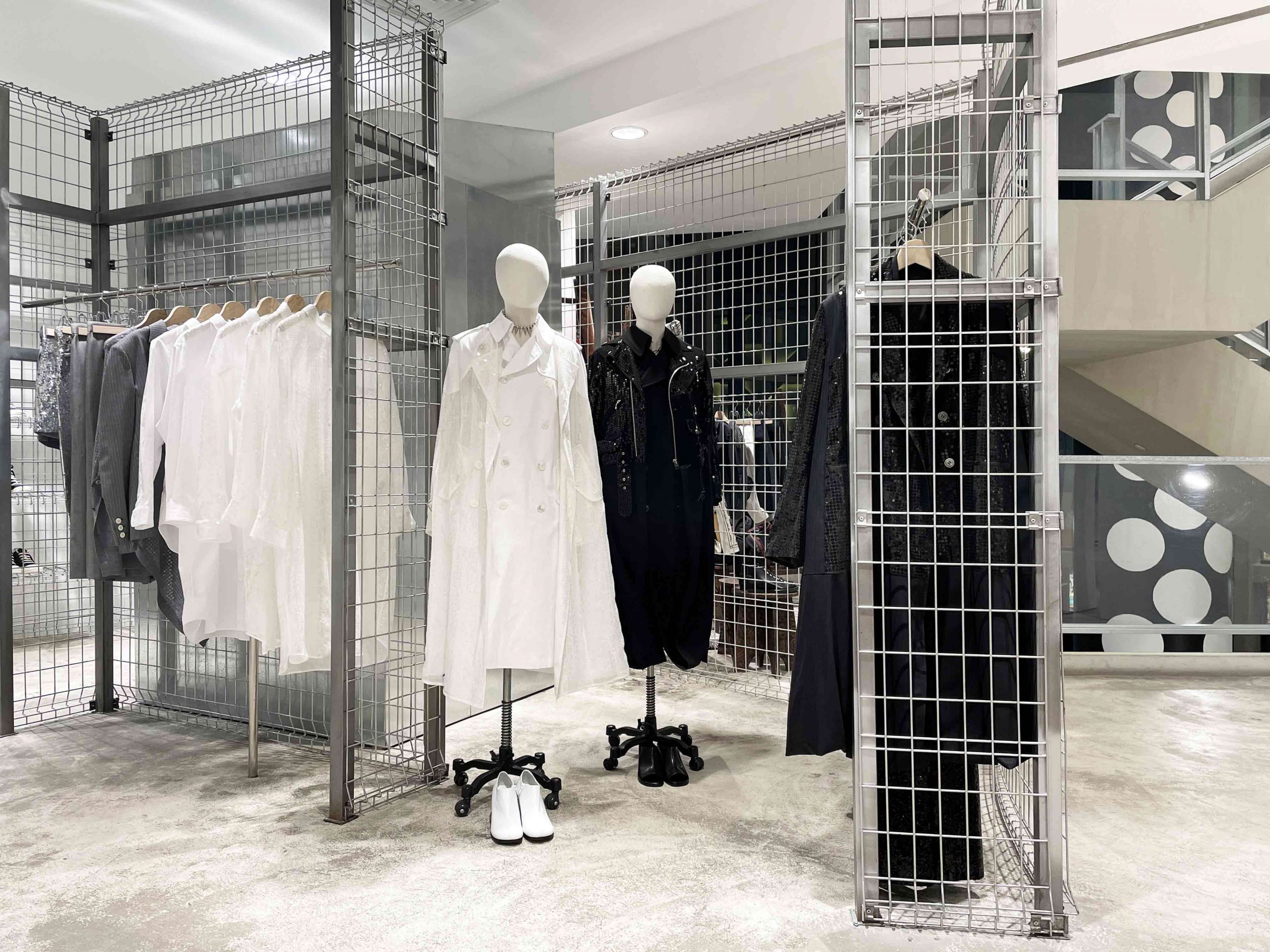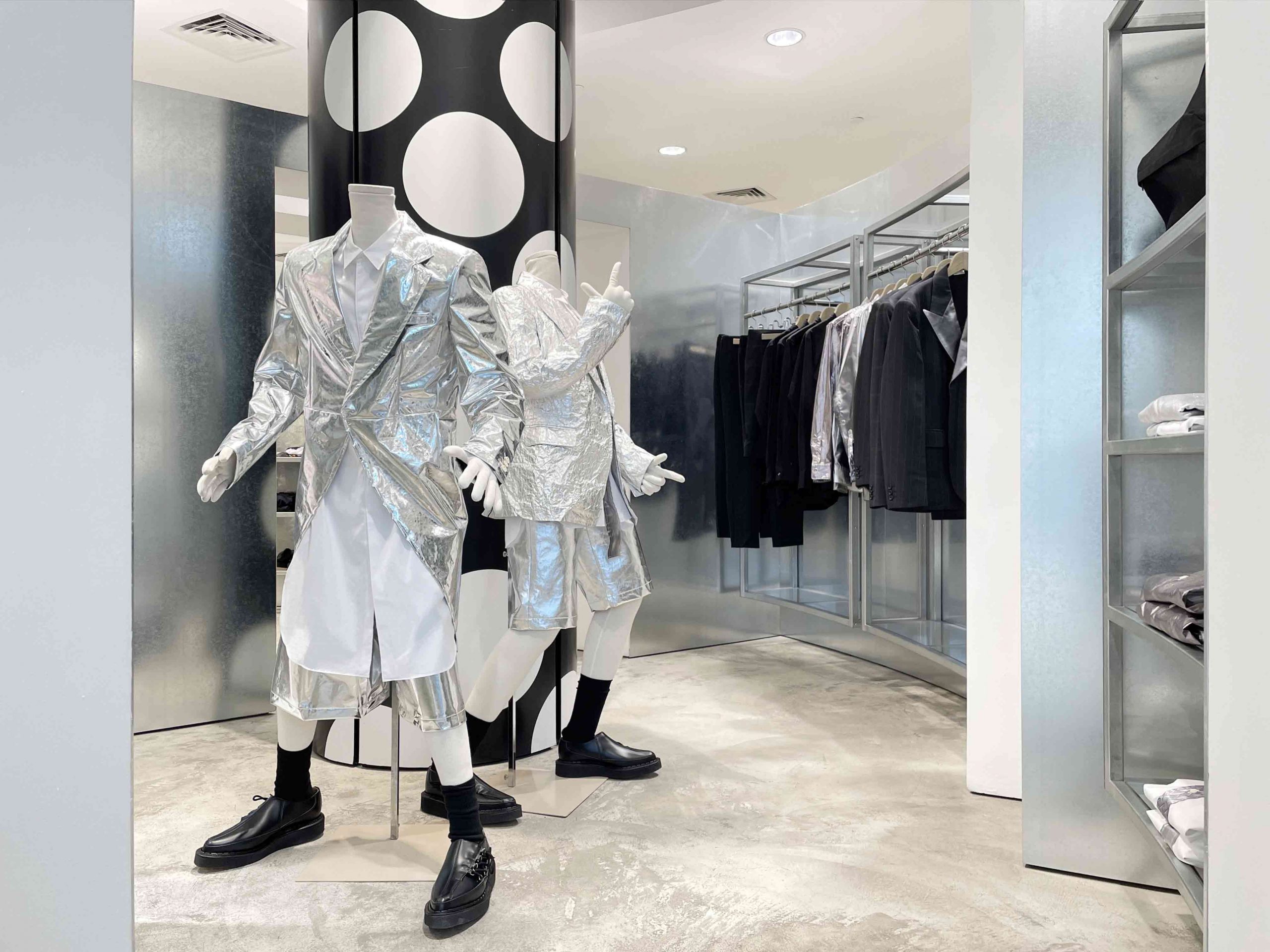 COMME des GARÇONS HOMME PLUS 2021 春夏系列位于三层,新系列被称作「METAL OUTLAW」,即大面积采用金属银色等构造立体剪裁。虽然款式大多为修身西装外套和休闲裤,却大多以反光的金属色调出现,即使是简单的白衬衫和拼接单品也均带有对比色的缝线和不对称的镶板。