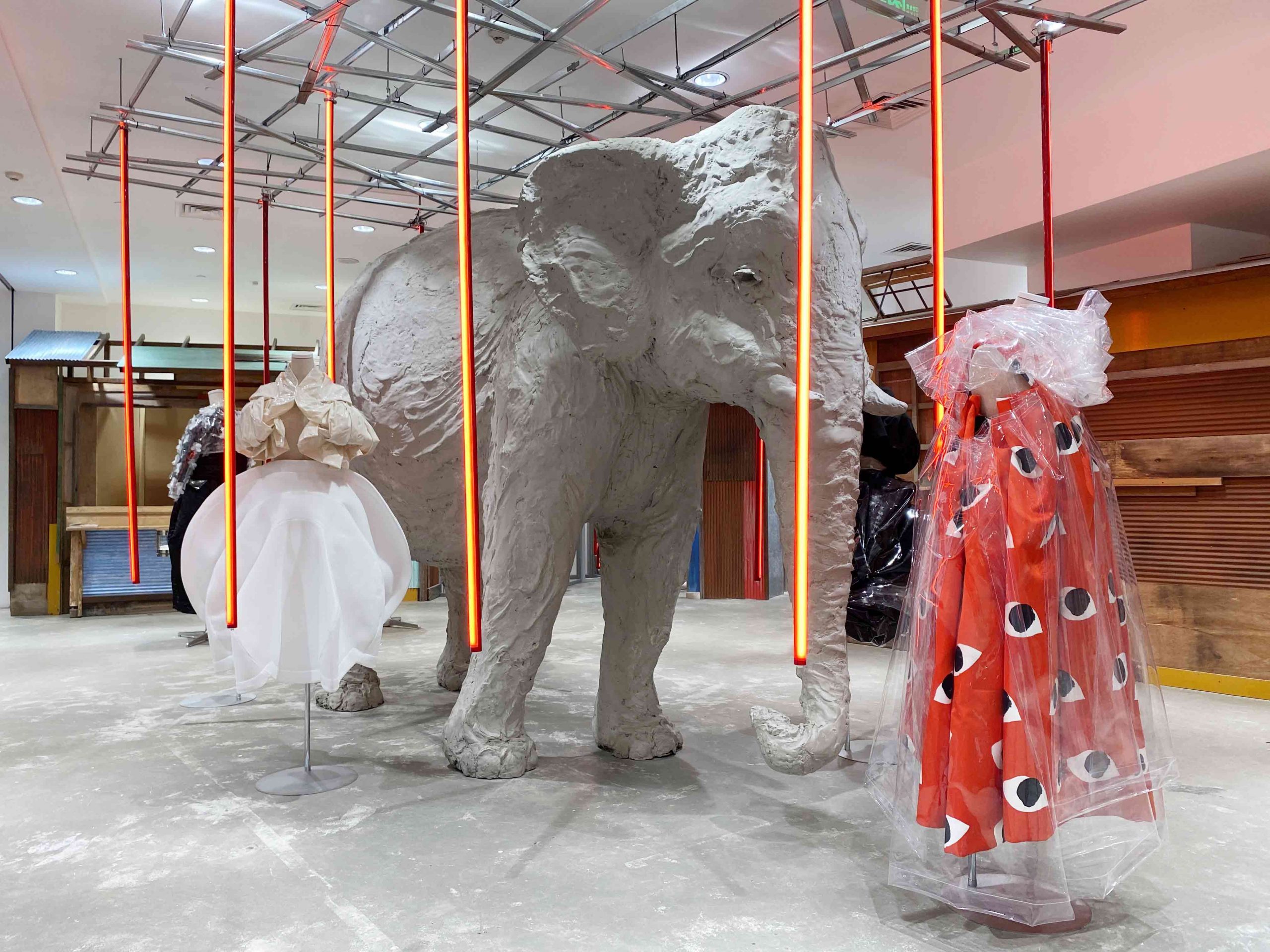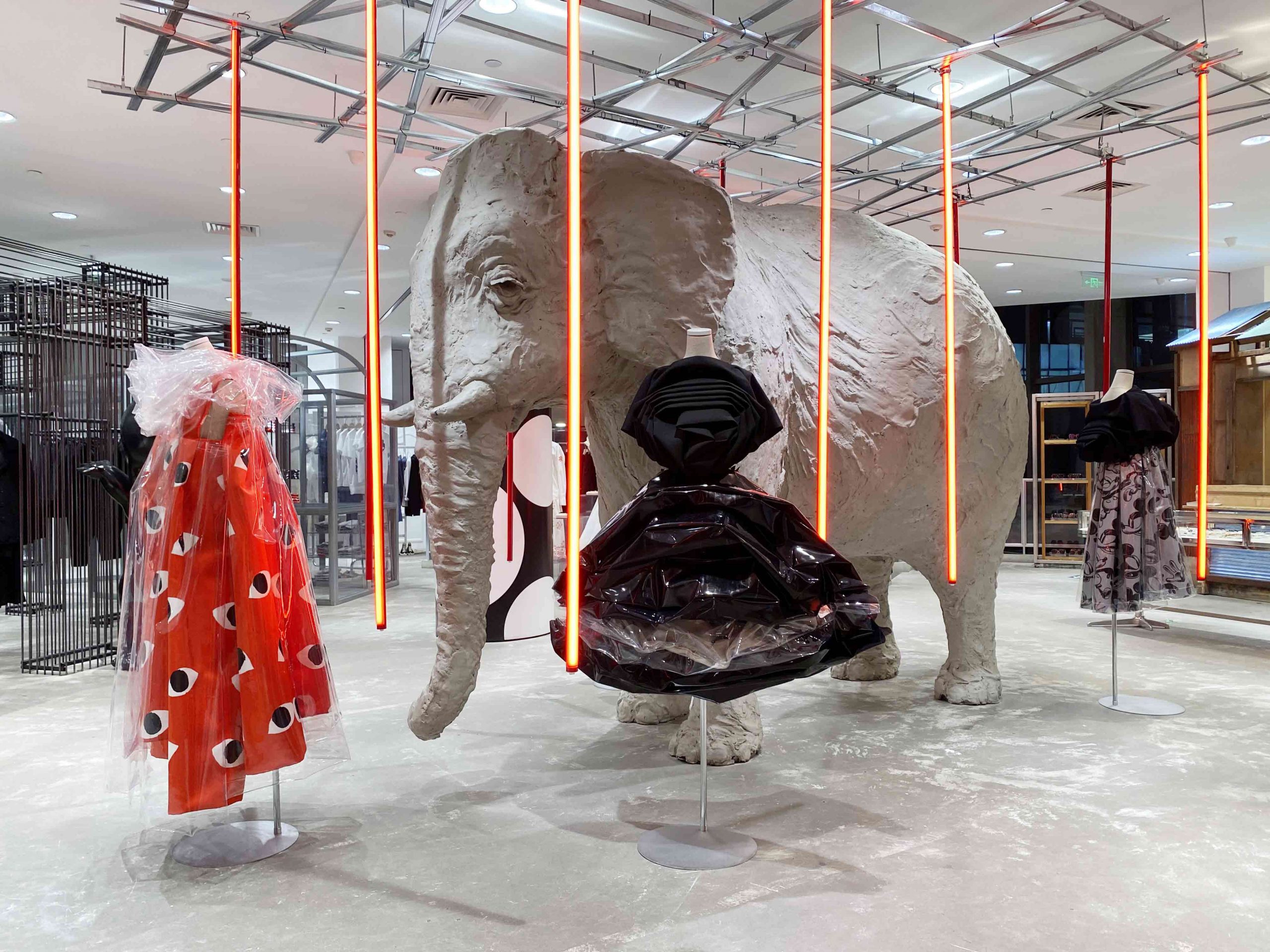 进入正门后, 映入眼帘的是以 COMME des GARÇONS 2021 春夏系列布置的全新 Elephant Space 。COMME des GARÇONS 本季以「不和谐音」为题进行创作,将殷红的灯光渲染为背景,每个造型皆在廓形、材质等方面露出不和谐的失调感——透明聚氨酯材料制成的连衣裙上,大面积印铺满 PLAY COMME des GARÇONS 惯常使用的大眼红心;卡通形象诸如米奇和米妮的加入,为此间的不协调加码——它们以连续堆叠的图案出现在裙装中,使得不和谐的元素往复出现。