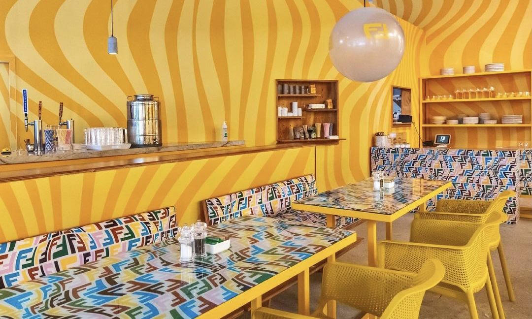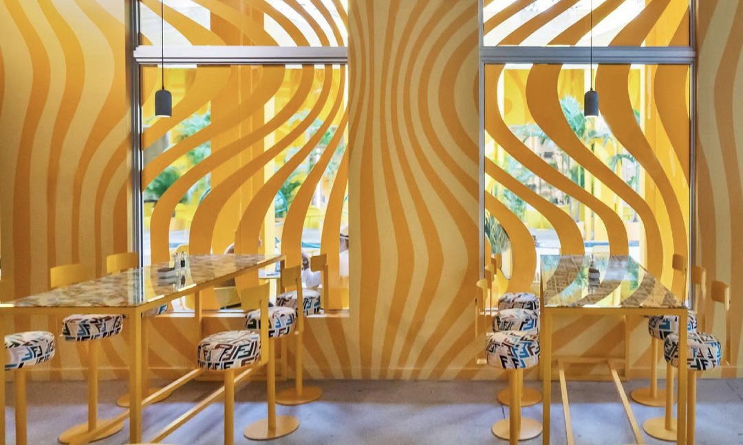 近日,FENDI Caffe 最近在位于迈阿密设计区的限时咖啡店正式开业。该限时咖啡店将于 7 月 5 日前在 OTL 餐厅展出,设计团队对场地进行了全面改造,注入了亮黄色的标志性色调,可以在菜单、桌子、凳子和长椅上找到艺术家 Sarah Coleman 为 Vertigo 胶囊系列创作的全新 FF 设计。