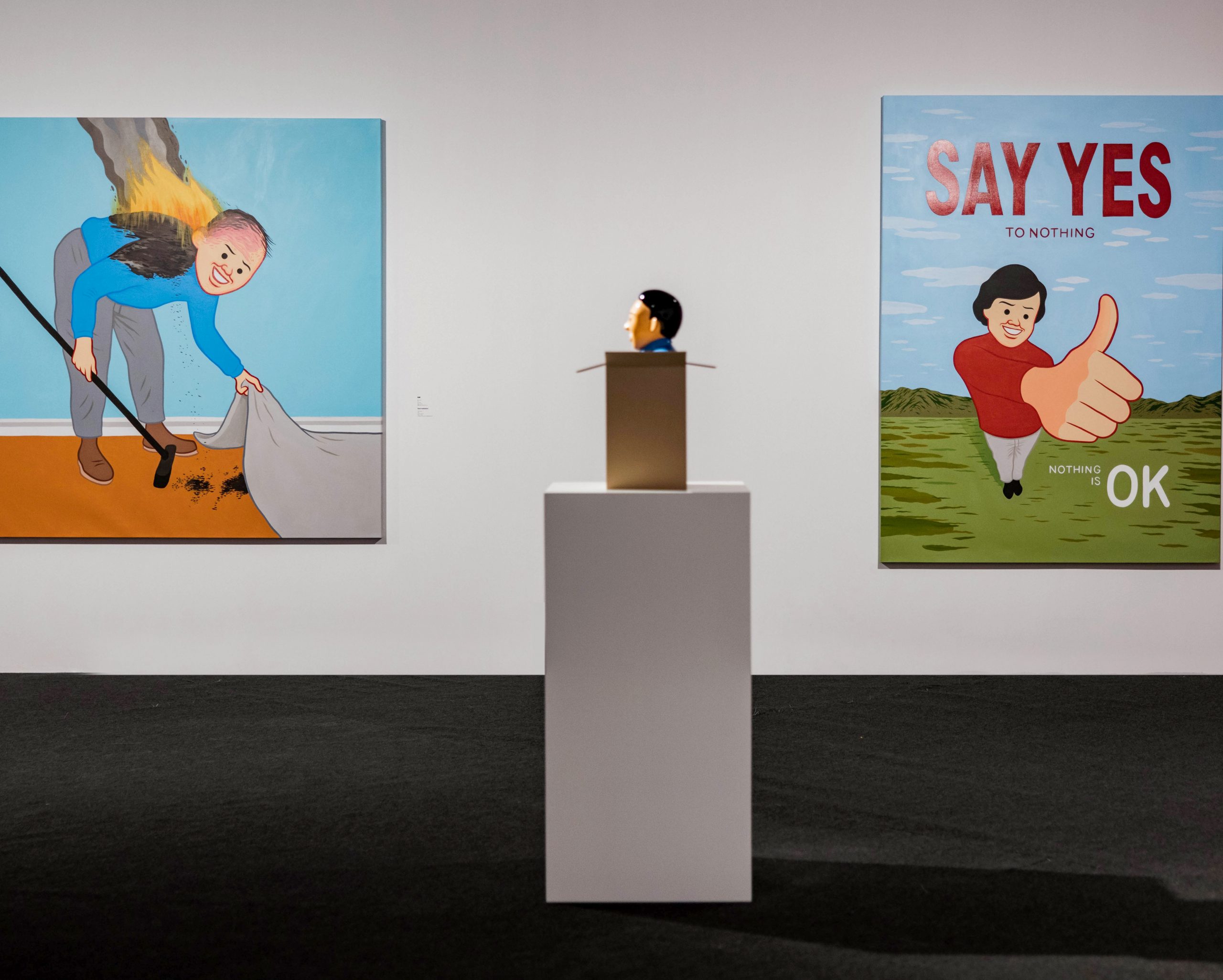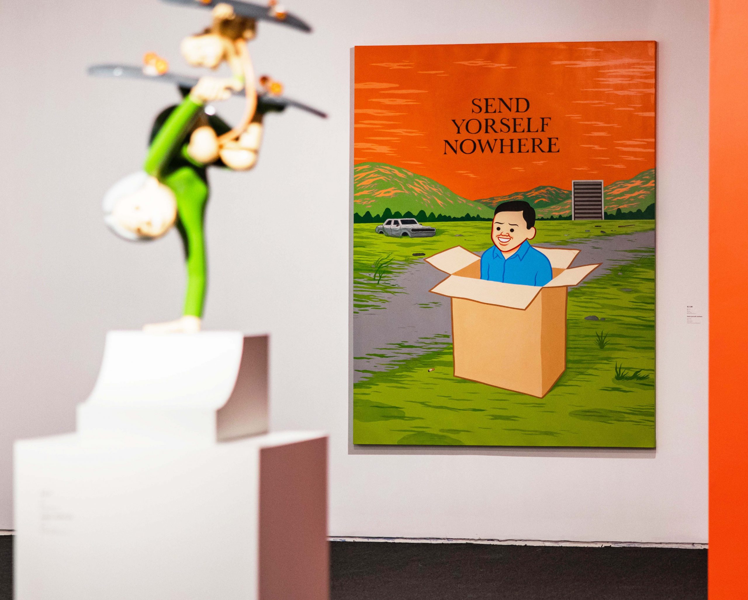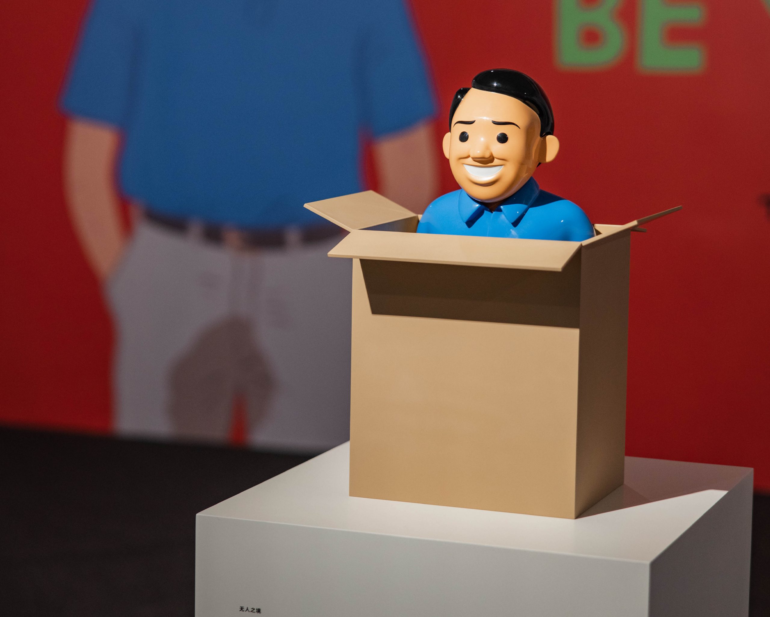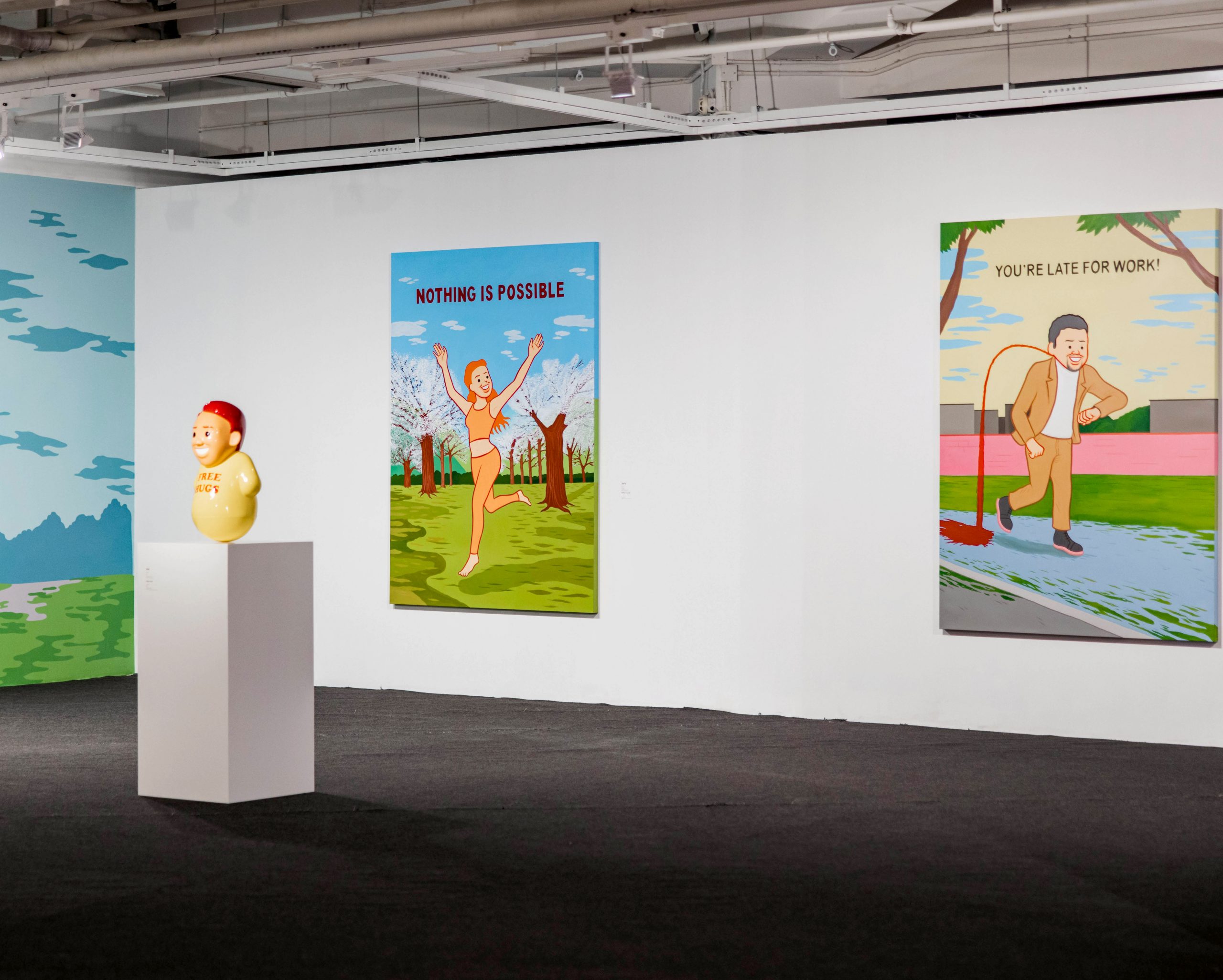 展览的重点展品包括十一幅全新的压克力帆布作品,艺术家一改以往的简约⻛格,在色彩鲜艳、⻛格迴异的画作上配上细腻的背景细节,奠定下其创作生涯中一大重要的里程碑。其他展品包括连串令人哑然失笑的有趣短片、从未公开展出的雕塑作品,及以超现实的极端方式呈现,一 组标签着「抱抱我」的真人等高不倒翁雕塑装置作品。