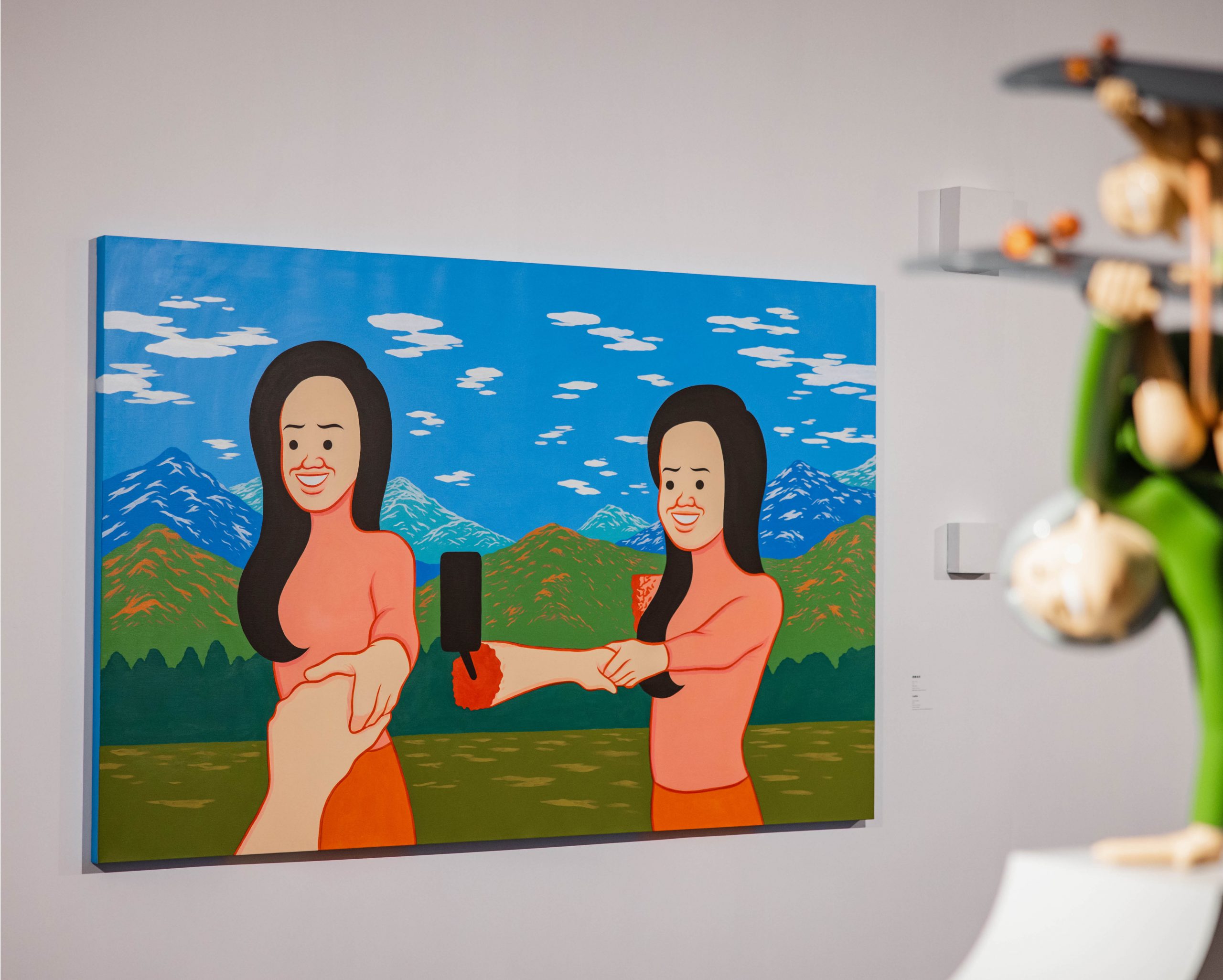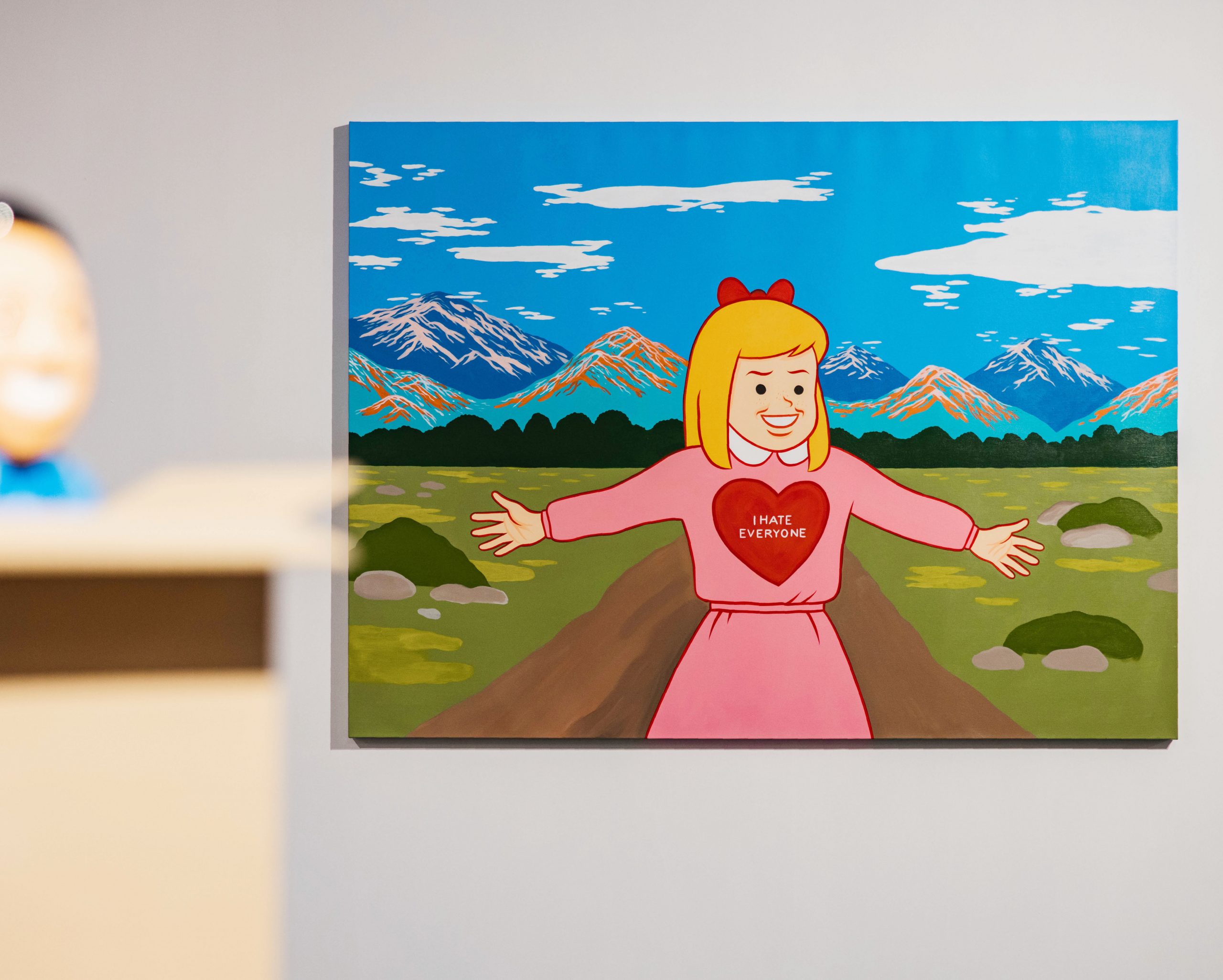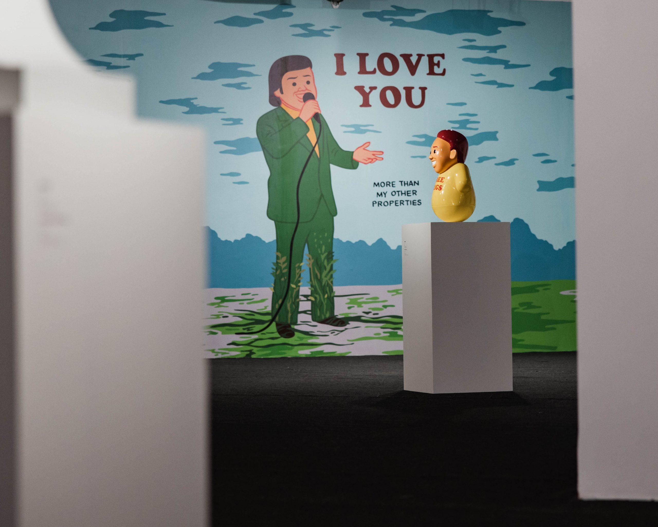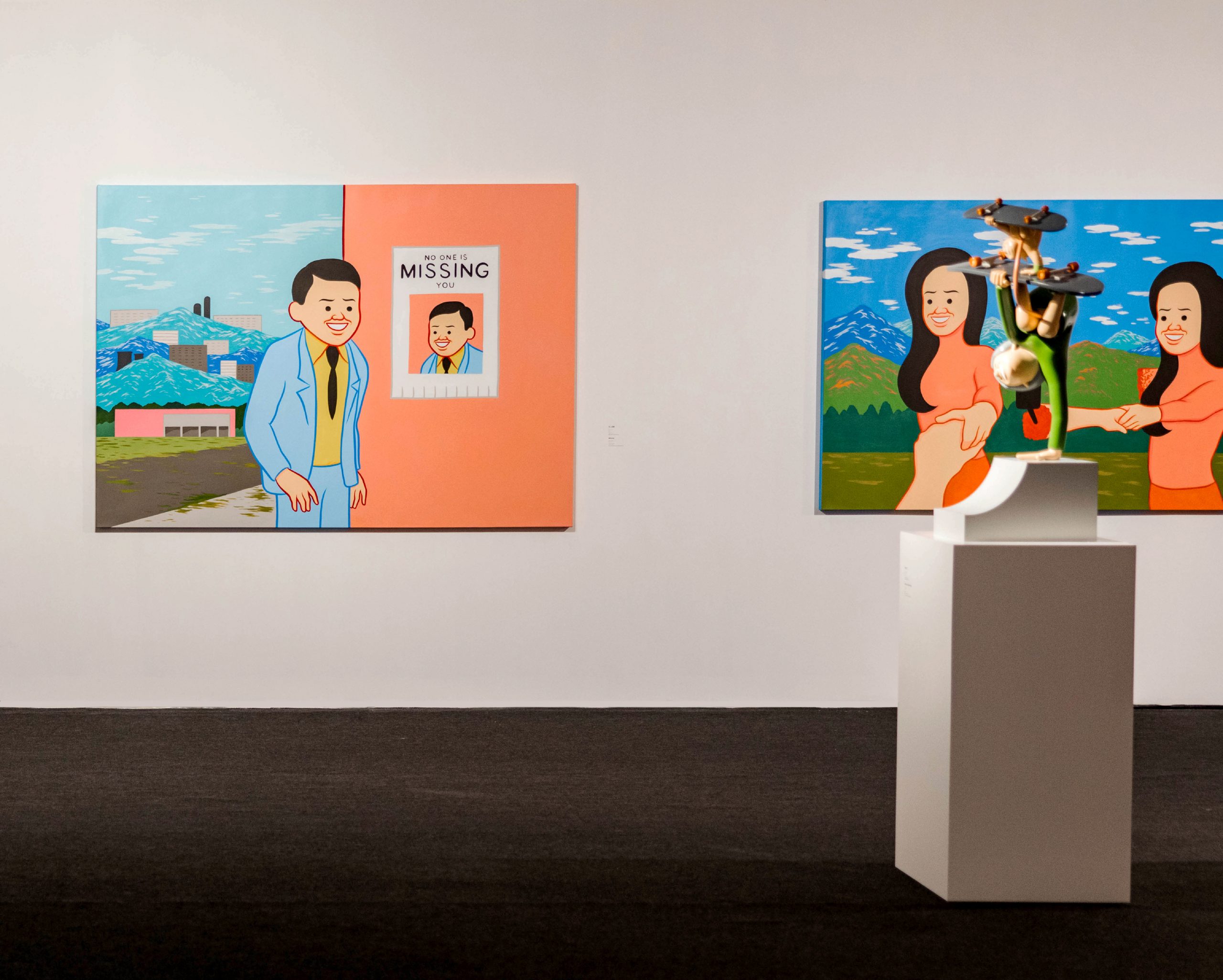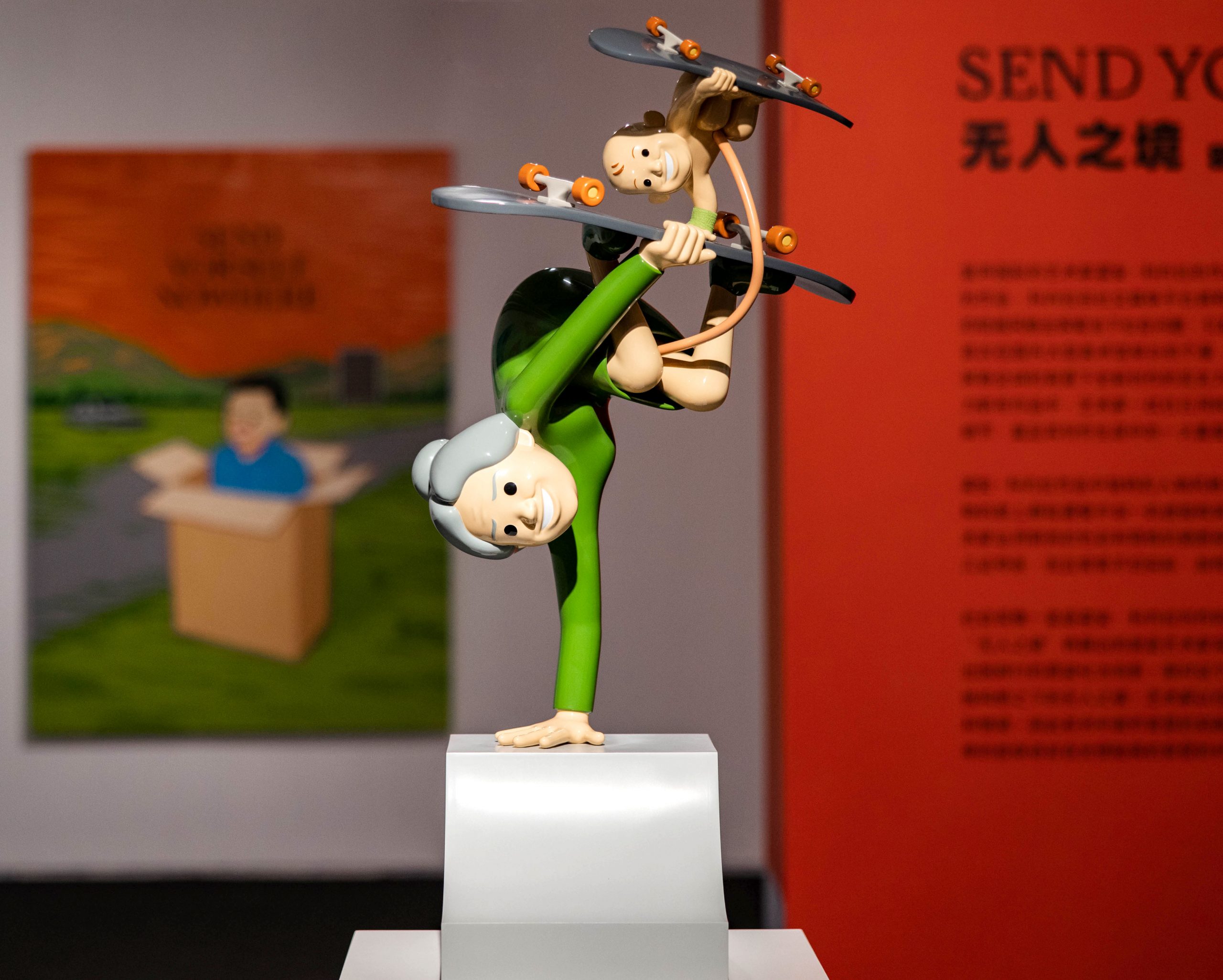 展览的重点展品包括十一幅全新的压克力帆布作品,艺术家一改以往的简约⻛格,在色彩鲜艳、⻛格迴异的画作上配上细腻的背景细节,奠定下其创作生涯中一大重要的里程碑。其他展品包括连串令人哑然失笑的有趣短片、从未公开展出的雕塑作品,及以超现实的极端方式呈现,一 组标签着「抱抱我」的真人等高不倒翁雕塑装置作品。