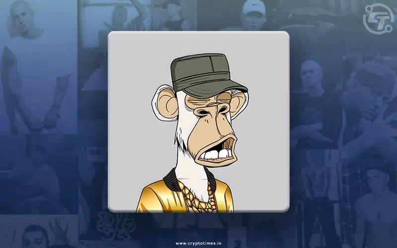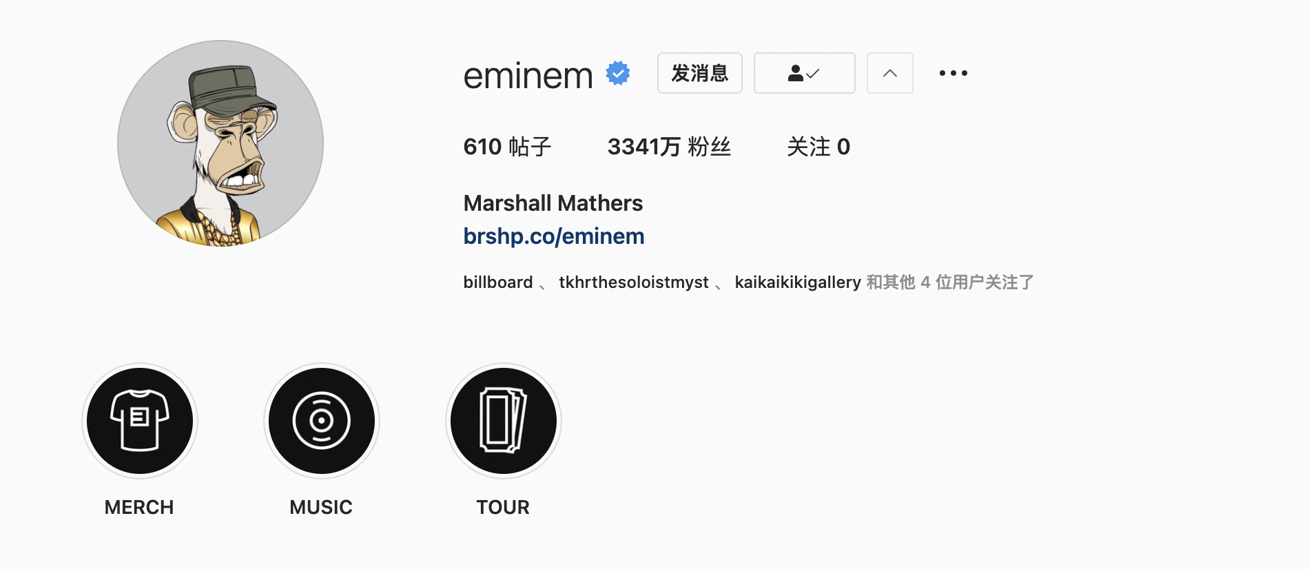 明星加入 NFT 热潮仍在进行中,日前,美国说唱歌手 Eminem 以 123.45 太币(价值 453,776.28 美元)购买了 Bored Ape Yacht Club(BAYC)NFT #9055。该 NFT 中的猿猴戴着 Kangol 平顶帽和大金链的形象与 Eminem 的造型非常相似,是由 BAYC 的一名成员在 Twitter 上以 @Gee__Gazza 的名义出售,随后,Eminem 还将其设置为社交软件账号头像。