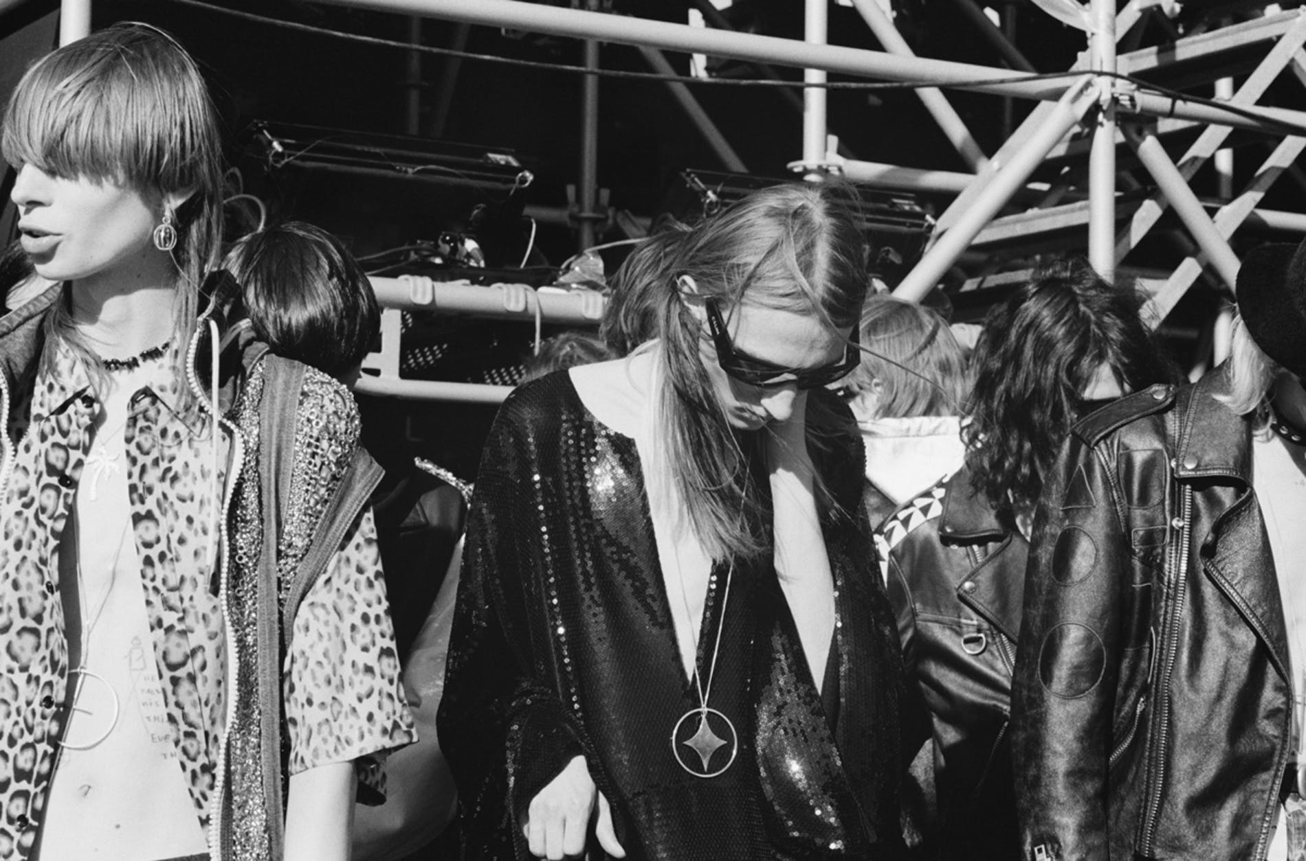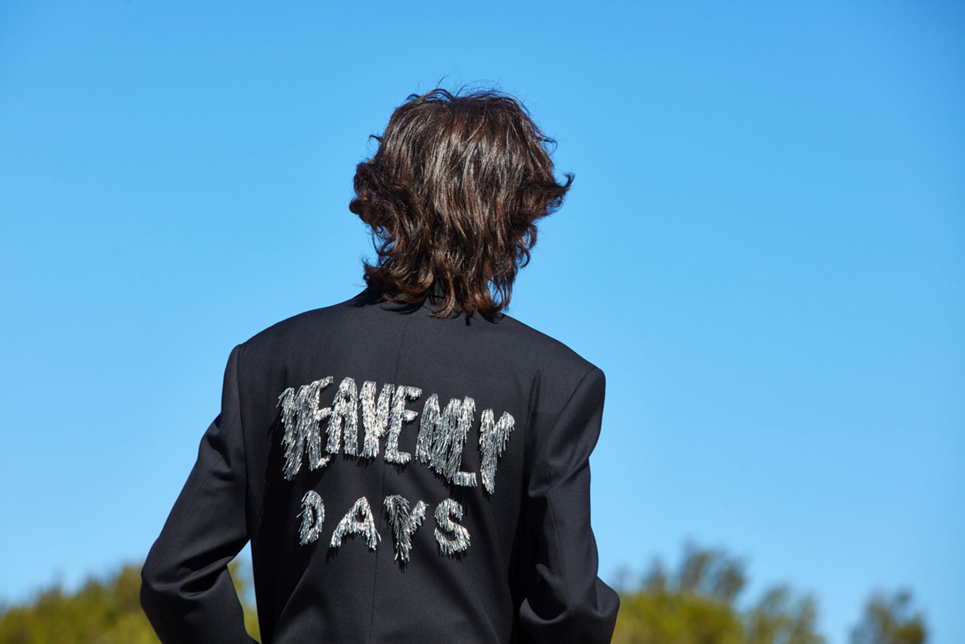 黑色西装外套背面印有「Heavenly Days」字样,毛茸茸的银色字样展现了年轻的态度,Hedi Slimane 还结合波西米亚元素打造了摇滚阔腿裤和水钻背心。新款「Elephant Jeans」采用了超宽裤腿设计,下摆宽约 38 厘米,低腰的设计复古气息十足。「Surf Flare Jeans」的灵感则来自于洛杉矶的冲浪者,也是一款喇叭形中腰牛仔裤,体现了本季融合街头文化的风格。此外,搭配「Elephant Jeans」的「Celine Bulky」靴子等单品也将一同登场。