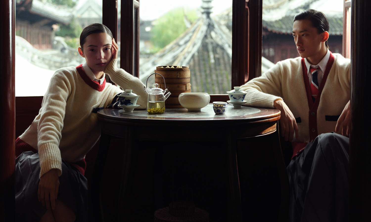 Thom Browne 于日前正式上线新年系列大片,系列包含经典典灰色制服、黑色礼服与红色季节单品。该组大片由摄影师张家诚于上海拍摄,超模雎晓雯、余航共同演绎。