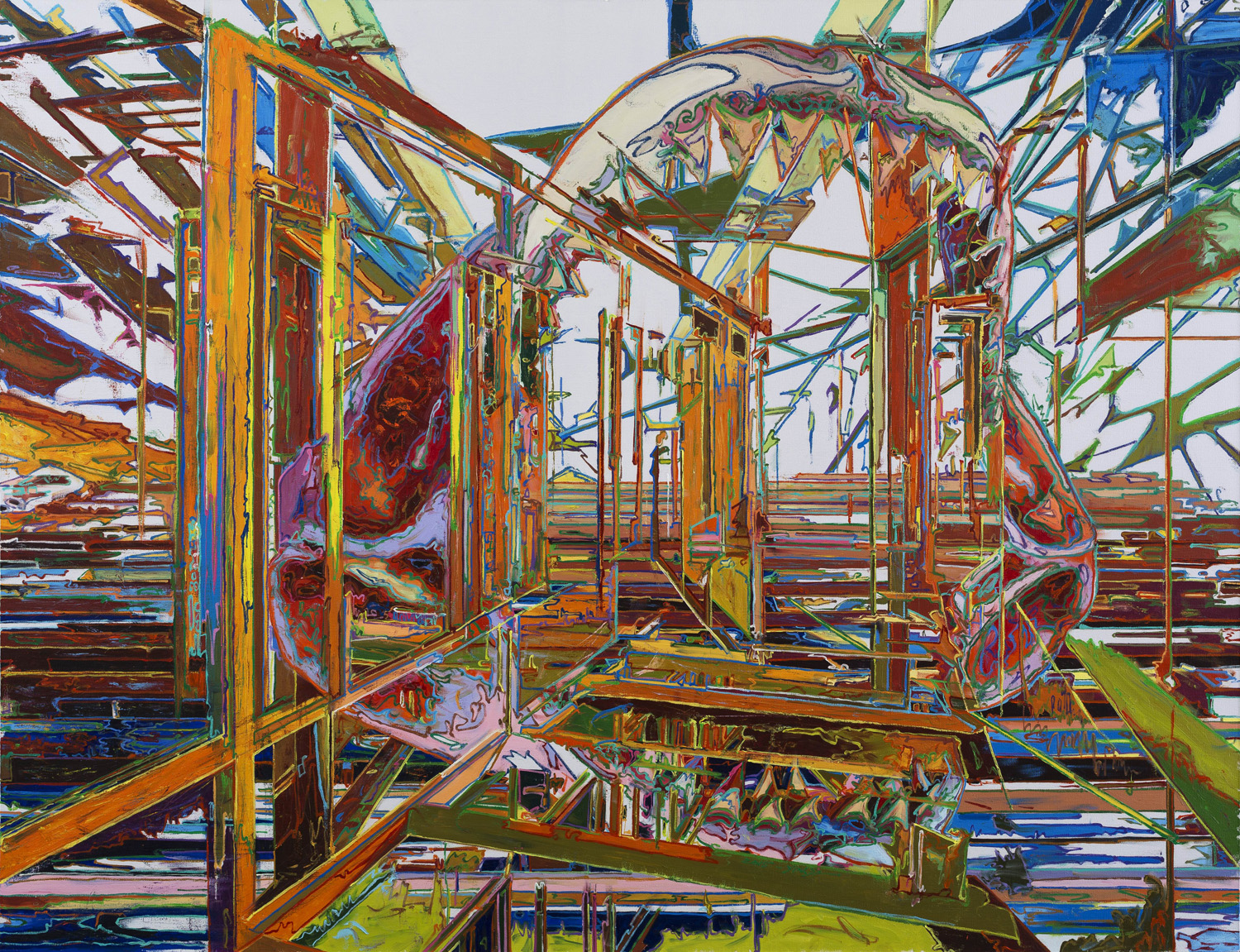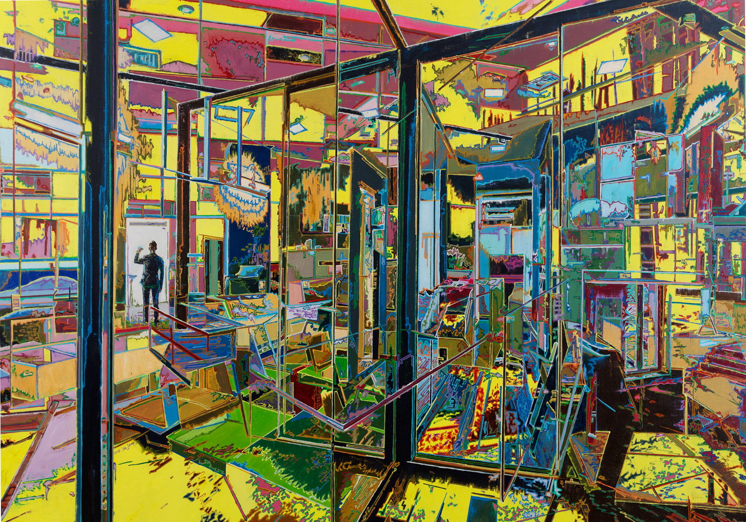 在由金的作品中,楼梯、爬梯、门窗、长廊、轨道和水域航道提供了空间位移的“可能”,成为从一点伸向另一点,从一个空间进入下一个空间的“通道”。由金的绘画起源于数码时代的视觉经验,在他开始的作品中,他将人物置于数码曲线所呈现出的水域、街道和各种室内场所,营造了一种电子虚拟性的虚幻视界。这种虚拟的幻界在当代已然媒介化的现实中成为一种波德里亚意义上的“超真实”(Hyperreality),在这个当代人习以为常的幻象中,现实本身仿佛在超现实中坍塌,从媒介到媒介,到处受到图像的诱惑,图像重组并再生产了一种全新的拟像视界。今天的对外在世界的抽象不再是对风景、地图、复制品、镜子或概念的抽象,拟像不再模拟某一具体地形或某一物质,而是进入仿真(simulation)阶段,这是被代码所主宰的目前时代的主导模式,传统的表现和反映真实的规律被打破,现实坐标消解,幻觉与现实混淆,世界成为“模型”的重组和再生产,模型构造了新的真实,一种超现实。世界仿佛成为一个媒介性的“超真实”的屏幕,在这个屏幕上,“观念”成为实验性的发动机。在拟像时代,“通道”也随之从柏拉图所描绘的“线性洞穴”被打散重构,转换为一种“观念化”的“异次图式”,碎片式的通过、复合、临时性、不稳定性、奇观成为拟像通道的基本特征。这成为理解由金绘画中观念实验的基本语义。确切说,由金是用绘画的“观念”编码了一个绘画中的世界,让观念进入了“实验性”生产的虚拟现实,并在一个个奇观复合的结构中用“通道”建立了一种“观念的实验性”新模式,他将“通道”设置为实验性的出口、入口和不确定的空间变道。