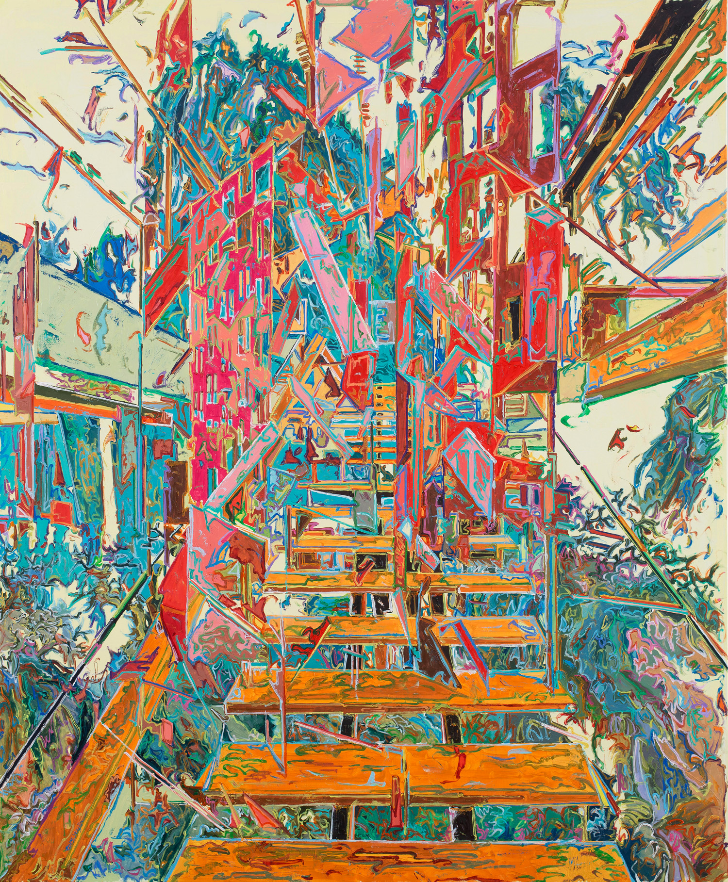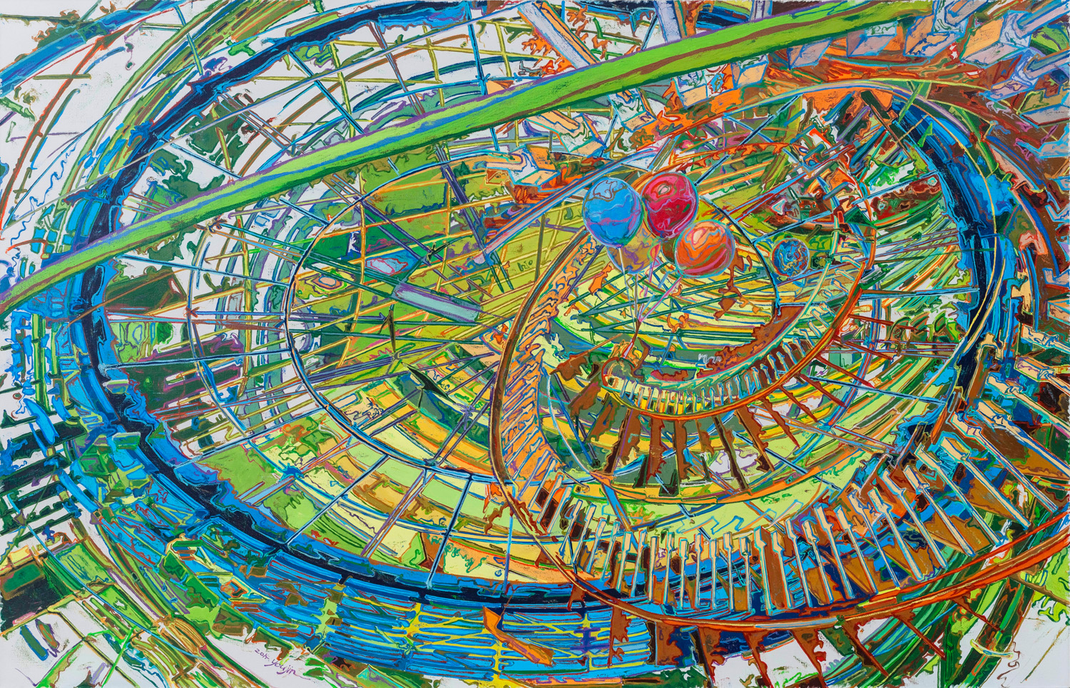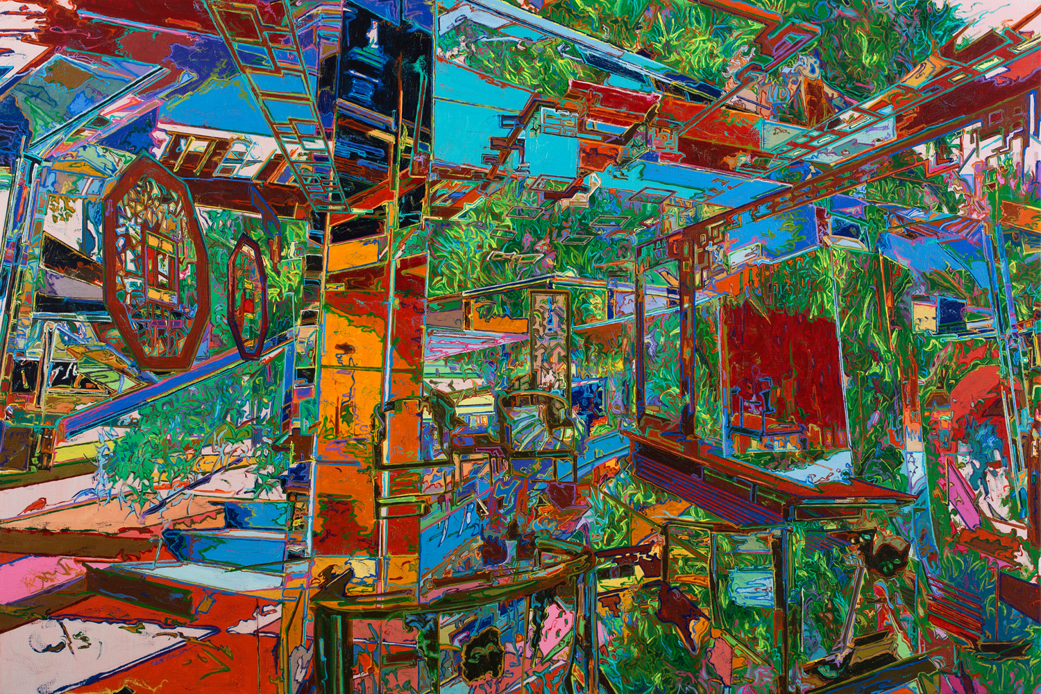 在2014年以来的绘画中,由金强化了空间的荒诞感,将其动态化到观念主导的强烈运动程序。原本安稳踏实的三度空间的现实间架被碎片重组的剧烈所替代,观念的发动机将视觉引入由急速的拐弯、旋转上升和错综复杂的模型演进和派生震荡,空间的多重出入口和逃逸线如同吉尔·德勒兹的“块茎理论”(rhizome)恣意生长,“通道”在这里表现出复杂的后现代感,这已与柏拉图所描述的洞穴通道完全不同,空间次序的多重性决定了“通道”进入“实验性”的戏剧编码。一旦空间成为实验性的剧场,其中的故事也必然发生转换,在这里“现实空间”形态下的“青春体验”转换为更具社会性、事件性的意义转型,并延伸到文化符号性的体验。《在这里,我无法看见你》空间成为“立体主义”(Cubism)式的破裂、解析和重新组合,透视的再现原则被打散成为不同镜面的碎片幻觉。《努力地飘着》成为螺旋上升的游乐场过山车式的疯狂,并带有“未来主义”(Futurism)的狂飙属性,表现运动成为这个螺旋体空间的基本视觉基调。《最近的远方》、《悄悄话》、《看过片段的记忆》、《无奈的观看》、《无法处理的异常》、《路径-后花园》、《“出口”你好》中的空间由框架性的直线建立了基本的结构,拉伸到多维度的出口,直线支撑起了空间的稳定秩序。《被遗忘的空位》则由急速拐弯的弧线构成了空间右拐弯式的弯道,突出了空间的速度感;《不值得留恋的就地》也带有空间的旋转性纵深感。《不是那个故事》直通的楼梯视点将画面引向破碎的前行通道,与《出发时的决心》、《无梯》都具有不稳定感和无奈。《弑度》加强了狂蟒之灾式的隐喻,《被支撑的脑洞》加入了观念的解析性并在视觉上融入了抽象的符号。《亦真亦幻的传统》、《搜索-最格局》、《在梦里》、《竹生无序》、《不知所措的风光》、《坚韧隐藏的部分》中开始出现中式传统家具、窗口、竹子这些带有中国文化元素的符号,这成为从对社会现实向传统文化拉开维度的重要转换。《一级乐园》、《第九个“伙伴”》、《两只老虎》在中式拱门、门窗和家具的文化环境中将画面的对象表现为熊猫、米老鼠和搏斗的老虎,让“故事”发生了隐喻和文化转换。在这些作品中,“通道”无处不在,成为切割空间、转换空间进行叙事的基本语法,在这里呈现了由金绘画的基本逻辑和巧妙的空间变换。