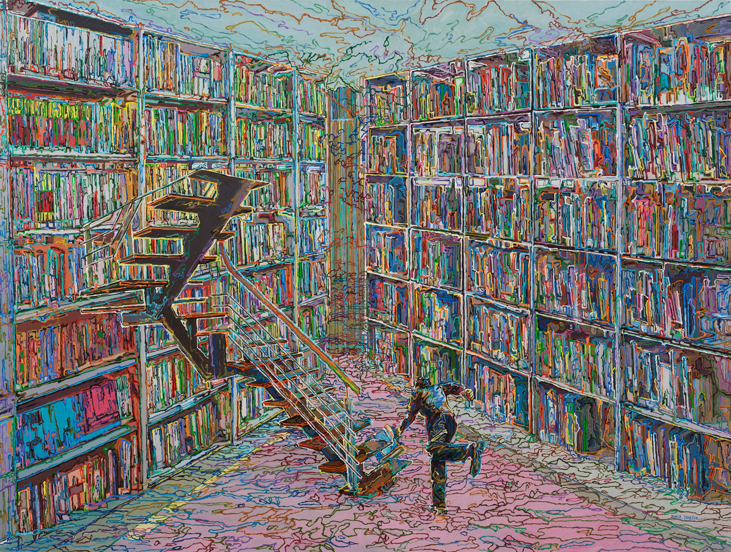 在2014年以前的大部分绘画中,作品中的空间结构保持了现实三度空间的基本间架结构,是一种被数码笼罩的现实形态。在这些空间中发生的故事具有社会转型期真实的现实性困惑和青年体验的近距离感,并伴有一定的非现实因素和荒诞感。由金的绘画由此开启了一种编码的逻辑,打开了一个由观念建构起来的空间,在这个秩序中“拟像”进一步模型重组,成为实验性的观念。如果将他的创作过程视为一个“观念实验性”的系统性个案,他的语言模式具有一个独立性的发展线索。他用绘画建构的“系统”成为了艺术家在这个拟像和仿真的时代用绘画进行“观念实验”开启更多可能的一帧帧刺入现实的影像。在《当我遇见你》和《茫然若失》中,站在街角汽车上拿着梯子的青年不知该如何选择和建立他的通道,骑自行车的青年处于室内半帷幕中停止并通过镜像看到一个不知所措的离奇通道,汽车、自行车和梯子的行动和位移作用被宣告了功能的关闭。《接下来的演讲》将坐在轮椅上的人的视线置于画面中的虚幻通道。《前方的礼物》将室内水域中划船的男子安排进中景堆积如山的礼物与远景憧憬窗外的女孩的隔断式叙述关系中。《偷书的人》画面中一位动用爬梯进入高处而另一位则通过地面过道跑向远方。《被隐藏的故事》中散落堆积如山的书籍与通向高处的楼梯、打开或关闭的门和窗子形成了另一种讲述和物的言说。而在《无尽的任务》和《一场被设定的戏》中,楼梯的存在方式在现实空间形态中发生了较为明显的“观念性”转变,开始脱离空间的现实性而进入超现实寓言的观念性。在这些作品中,那些作为空间位移工具的汽车、船只、单车、轮椅和梯子有的被废弃有的被置于无所适从,成为了人的生活和时代感受中的某种似曾相识的“现实表达”,在这里“通道”有时是打开的有时则是闭塞和关闭的,但都具有更多的现实因素,成为理解由金近来新作中内容的观念由来和演化踪迹的线索。