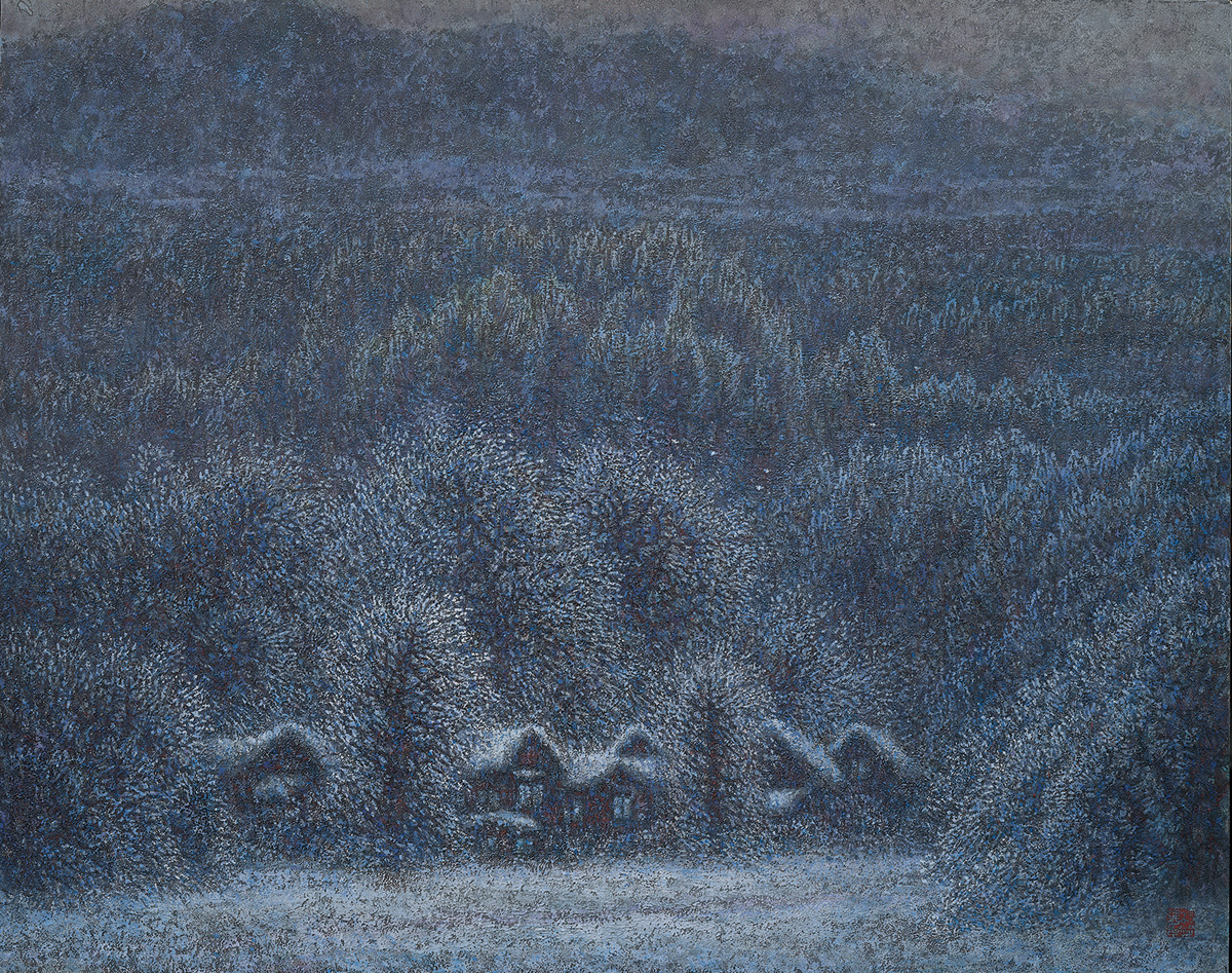 林国强的绘画题材主要体现在风景画领域。在林国强的岩彩画系列中,我们能够看到安宁的山村,在那些由三角形红屋顶串联起来的村落的前景,是具有典型东方田园世界中的农地和点景人物,构成一幅完整的图画。在《银装》《雪夜》《雪后山村》和《待春》等作品中,汇聚了画家从1980年代到1990年代对于“雪景题材”的关注。 在这些画面中,有雪夜中朦胧而灵动的灯光,从压满屋顶的一座座房屋中传来;有树枝与雪痕交织在一起那种自然界定的来自“黑白绿”的斑驳,再与毛茸茸的屋舍天然合一地结合,描绘出来自中国自然中的安居美感和美境;也有聚焦整颗树在银装后的夜晚所反射出“光幻感”的素裹视觉。