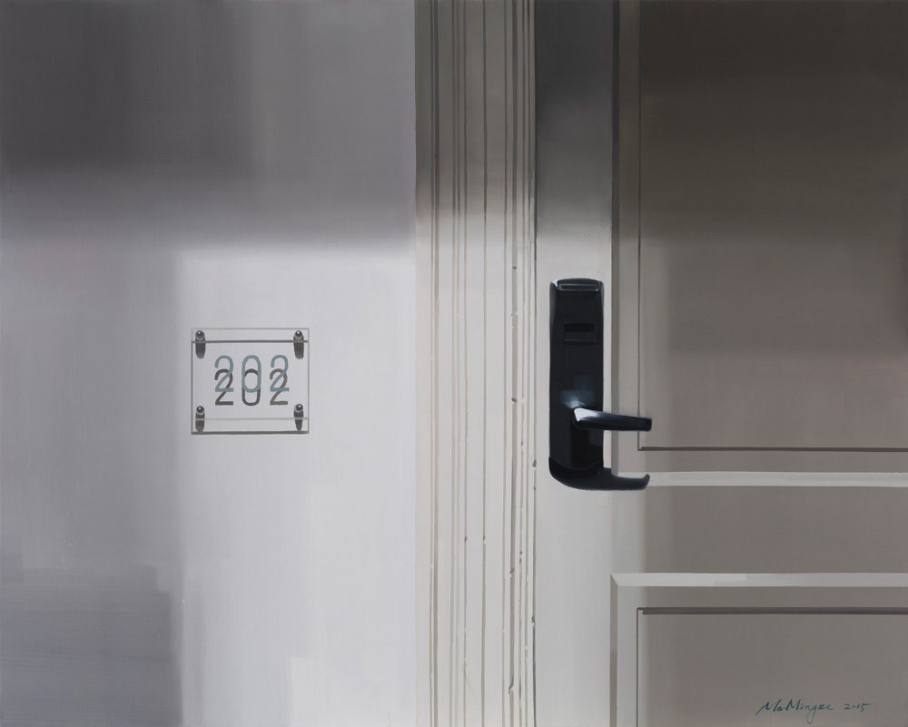 《X's Room》呈现了一个精心选取的切入角度,房间的门只呈现了它需要出现的部分,光度感与角度感的衔接让绘画作品所打开的空间进入艺术家有意描绘的部分,画面的“光亮度”集中在门把手和标注202房间的亚克力标识的视觉面积中,与周围面积围合成“门形”的“灰度”拉开了绘画作品的视觉结构,“门”的含义除了作为形象的“显性”也在这个“暗喻”的光度构成中引入了一种心理的感觉,一种瞬间的“暂停感”,在这个暂停中绘画获得了一种观念,也让语言进入纯粹的可感觉的状态。在这个光度感所提醒的观看中,图像的角度感同时发挥视觉作用,引起了一种“观看感觉”的发生,这实现了从图像的“角度感”、“光度感”进一步引发的观看在心灵感觉中的“温度感”,这种感觉的温度能够唤起记忆中某种独特的感性体验。同样的效应也在《Silver Linings 》这件作品中体现为一个“瞬间角度”的暂停中,那条门缝中透出的光形成了一种感觉层面的安静,绘画成为有“心理温度感”的图像,“角度感”和“光度感”成为特定“温度感”发生的前提。