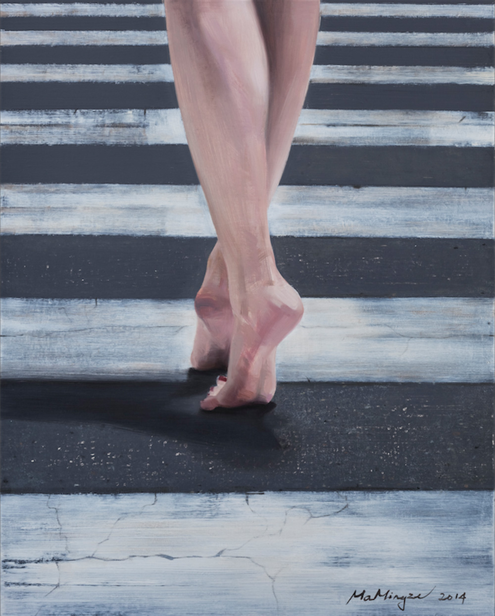 在马铭泽的其它很多作品中,对一些周边有意思的细小生活中的片段和瞬间的描绘成为入画的主要信息,例如《3、2、1 》、《无名书》、《白色琴键》、《不看手表的人》、《墨水》、《皮肤温度的1/2杯水》、《起床之后》、《高跟鞋》、《衣柜人生》、《失误的判断》等等一系列创作。值得关注的是,这些作品都似被亮光所“洗刷”和“漂白”,这也是马铭泽绘画中所有意使用的异乎日常光亮程度的“光感度”,从而在“陌生化情境”中营造出自传般的气质,而这种气质的产生是建立在马铭泽观看体验的个人感觉上的,即一种源自她自己日常体验的“微感觉”,带有细腻性的情绪支撑起了画面内在的信息。当这些作品放在一起的时候语境般地创造了一个上下文关系,在这个上下文中无论是画面中的钢琴与手、特定动作指向的女孩、马路斑马线上翘起的脚尖 、伸入杯中的手达到与皮肤同温度的水、起床后被刻意画出褶皱痕迹的床、衬衣口袋里漏墨的笔、缝中露出衣料一角的衣柜……,所有这些在日常经验的惯性中所被忽视的或被认为没有常规意义的瞬间都被按了视觉暂停键,以绘画语言的刷笔在“光度感”的画面中以“离奇”的方式呈现出有意选取后的局部和片段,这提供了艺术家所导向的“观看角度”。