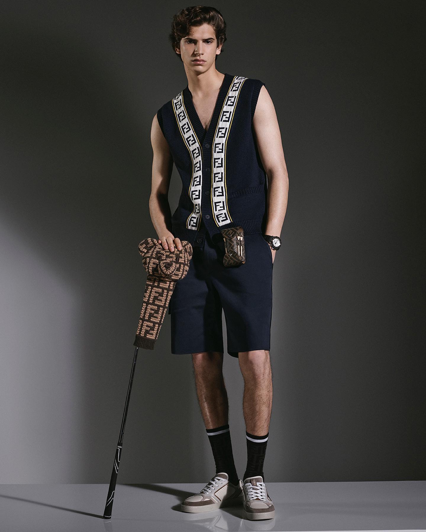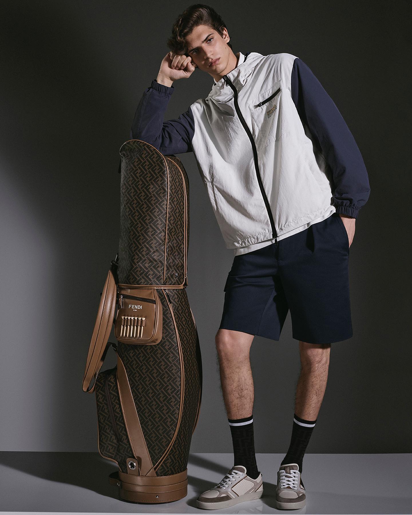 将品牌经典风格与运动休闲元素融为一体,FENDI 全新推出高尔夫胶囊系列。该系列将舒适性和精致性放在首位,米色和海军蓝色调与晴空下高尔夫球场的宁静氛围相呼应。服装包括领口饰有 FF 标志的短袖 Polo 衫、百慕大休闲短裤以及正面饰有两条垂直提花 FF 饰带的配套针织背心,重新推出的 FENDI Roma 徽标印在长袖棉质 Polo 衫和尼龙夹克上。配饰方面大胆有趣,除了带有 FENDI 品牌标志的高尔夫球和木制球座,高尔夫球包采用黑色 Cuoio Roma 皮革或标志性的烟草色 FF 徽标面料精制而成;高尔夫球杆套采用白色羊毛皮制成,黄色的 FF 标志醒目可见;另一款球杆套则形似一只用柔和棕色 FF 羊绒针织的泰迪熊。目前该胶囊系列已发布。