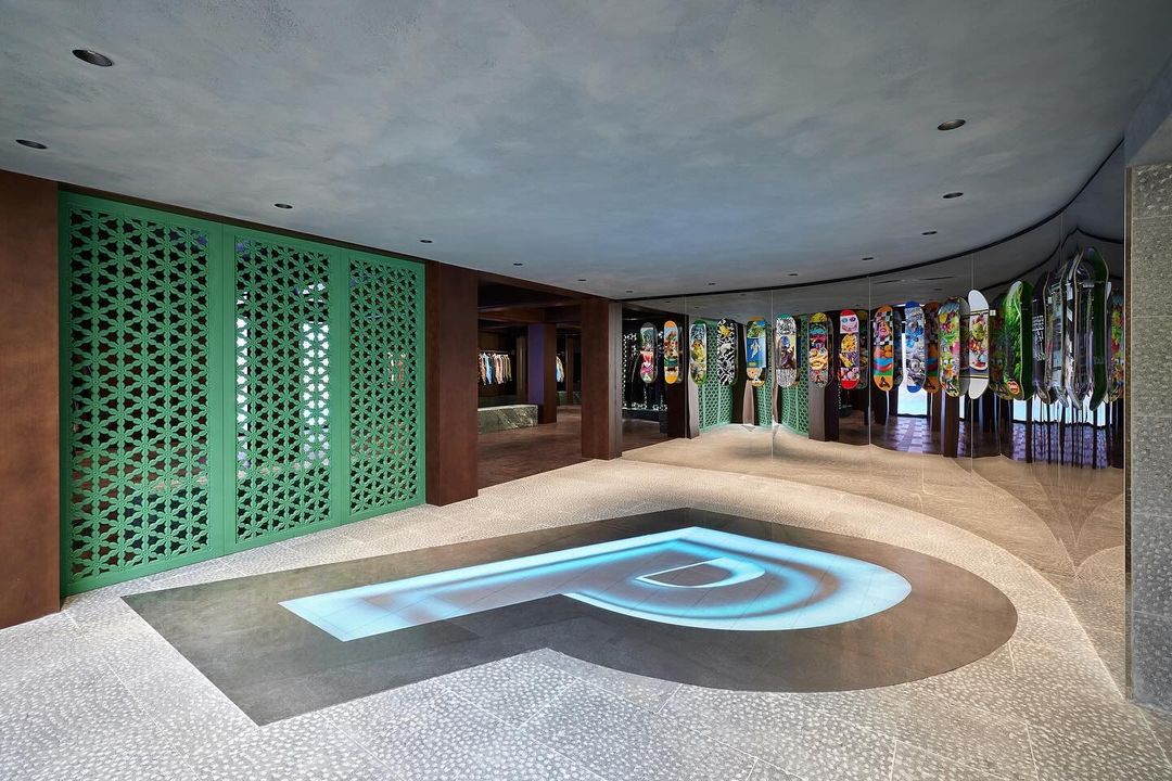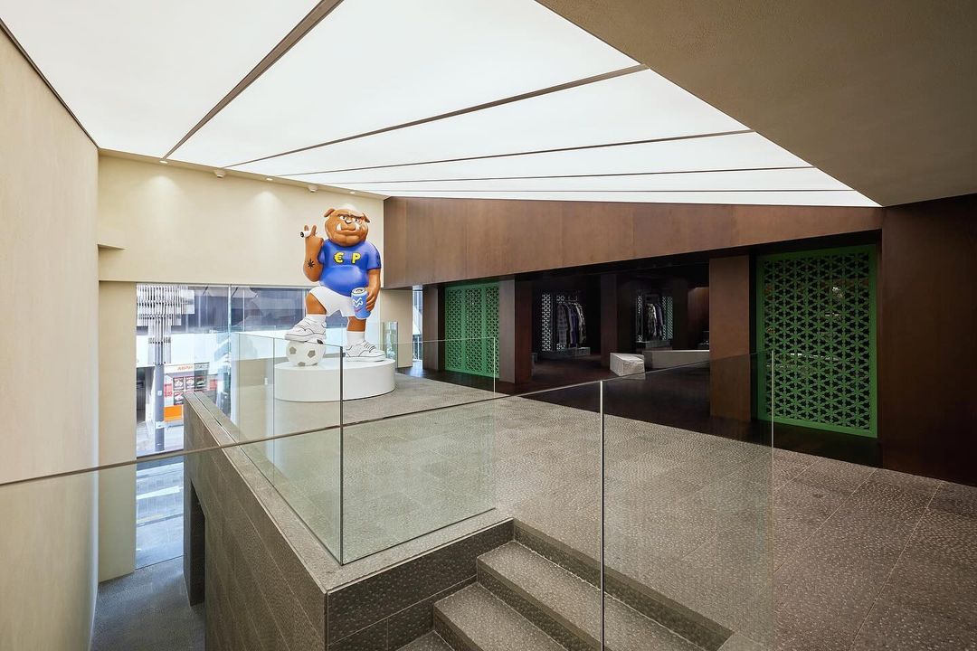PALACE 日前在官方社交媒体宣布韩国首尔门店正式开业,位于著名的狎鸥亭洞 (Apgujeong-dong)。店铺设有两层,纯白的外墙上注入倾斜的立体 PALACE 字样,室内设计的灵感源于「韩国宫殿」。走进店铺空间,映入眼帘的是地板上的「P」标志,绿色的木墙上有精心雕刻的细节,与弯曲的镜面展示柜相辅相成。在店铺内部,颜色更深的木材构成墙壁和地板,配件基座、服装架和访客的座位则以大理石材质打造。在二楼,通过一个巨型的屏幕展示最新的品牌计划,英国斗牛犬雕像则致敬了 PALACE 的品牌档案。受 Tri-Ferg 标志启发,画廊空间中心的长凳以碎石块造型呈现。值得一提的是,首尔旗舰店为 PALACE 迄今为止面积最大的店铺。