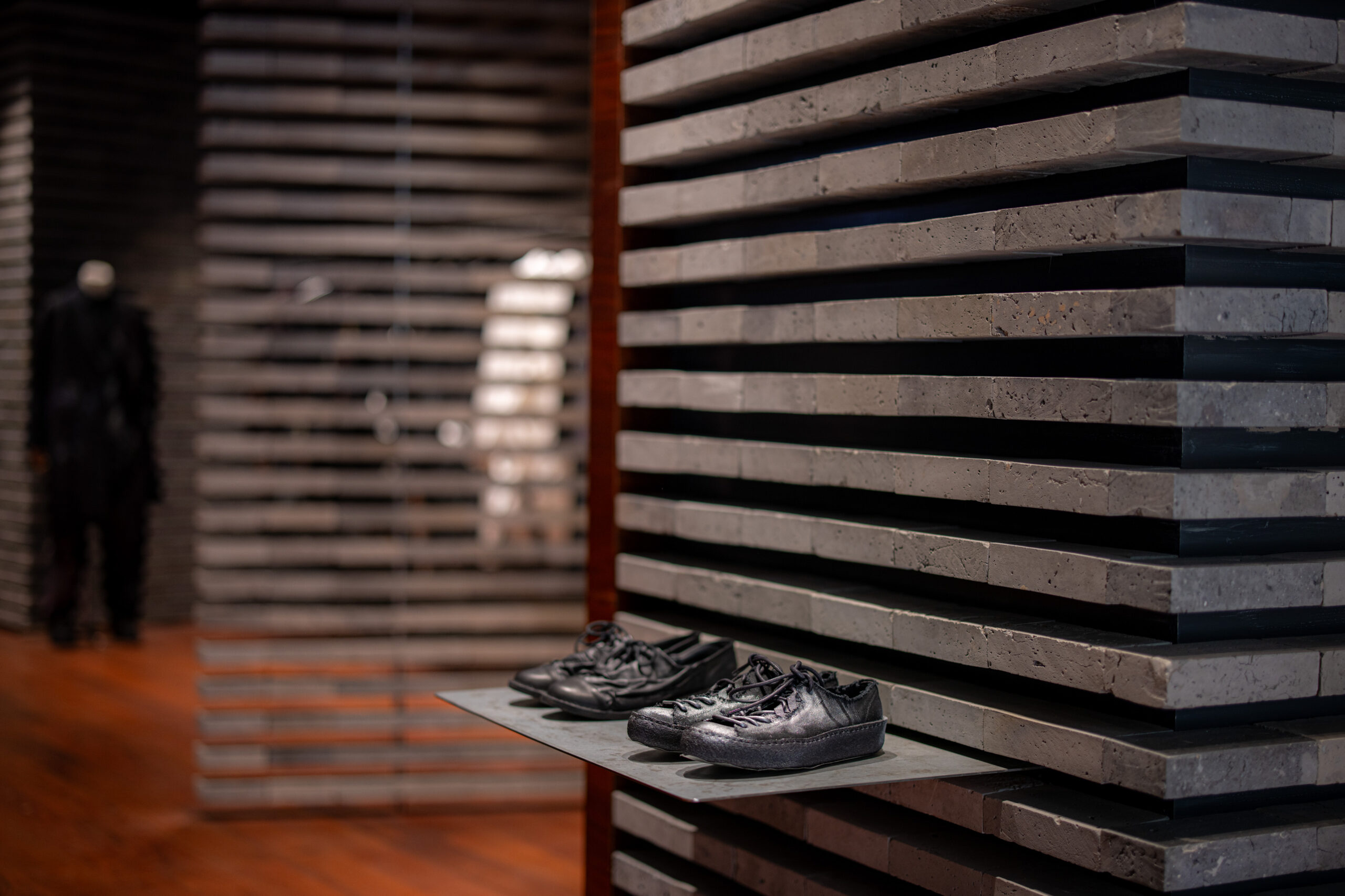 新店同样由日本 OSO 建筑事务所的建筑师 Michael Sypkens 和 Esteban Ochogavia 操刀,将上海老住宅区「石库门」的历史和文化融入设计,令整个店铺的呈现颇具城市特点。全店装潢采用与石库门相同的灰色砖块并通过留缝使其「漂浮」,创造出别具一格的屏风做简单的区域划分。天花板以同样的设计强化渗透感,令整体空间有了收放自如的视觉效果。在呼应上海传统街区风格的同时,也为 Yohji Yamamoto 构建了一个永恒的庇护所。