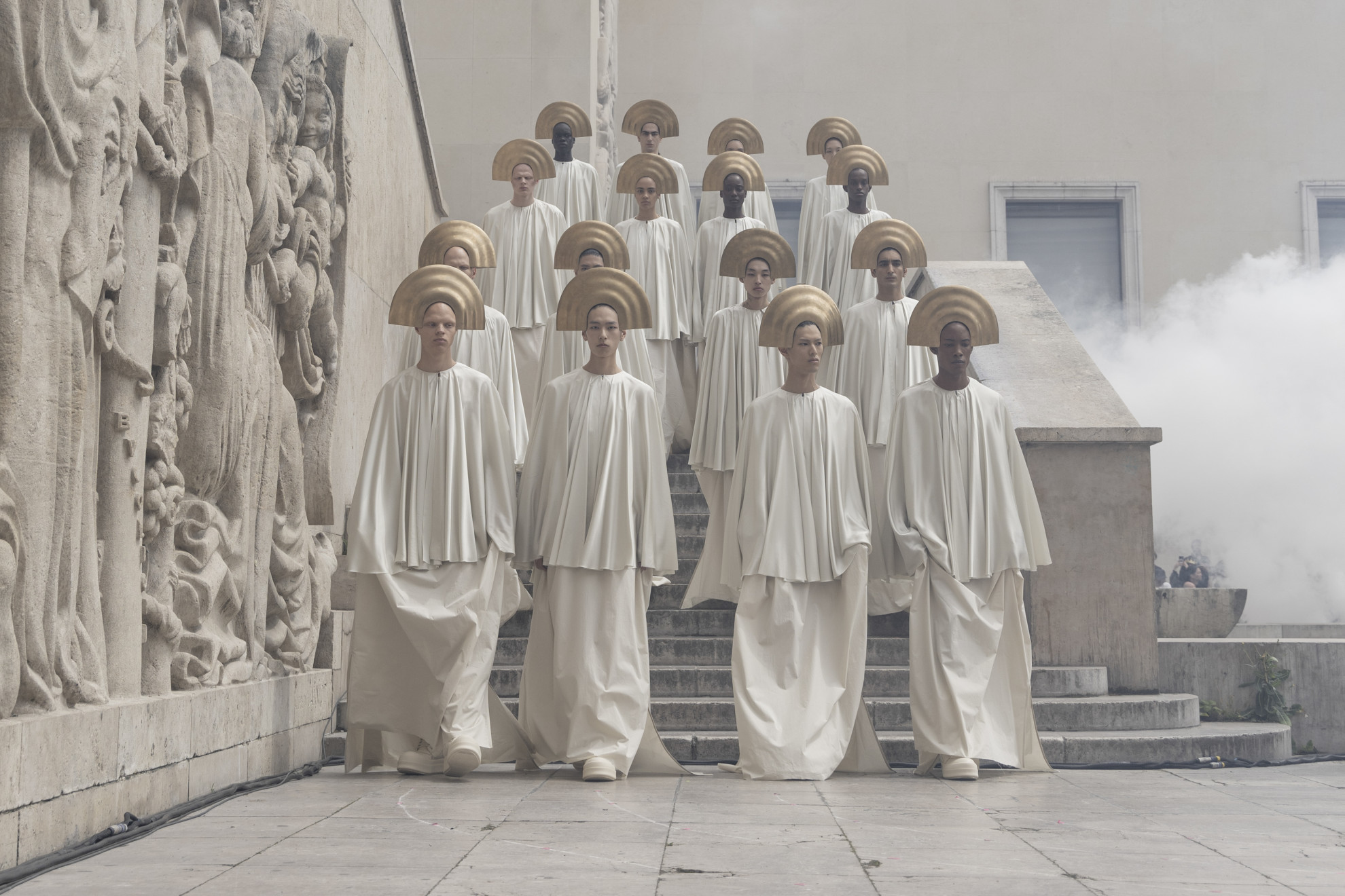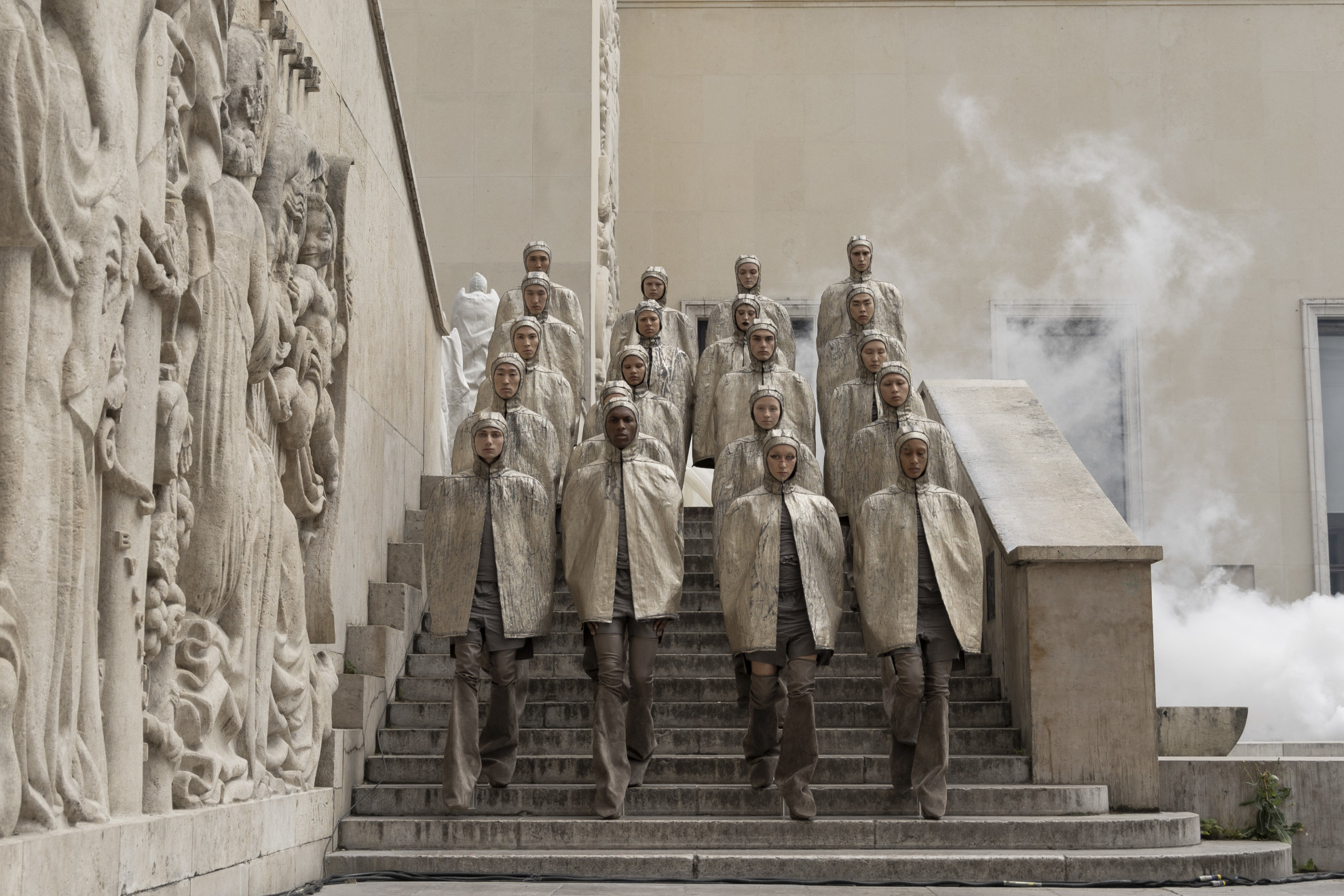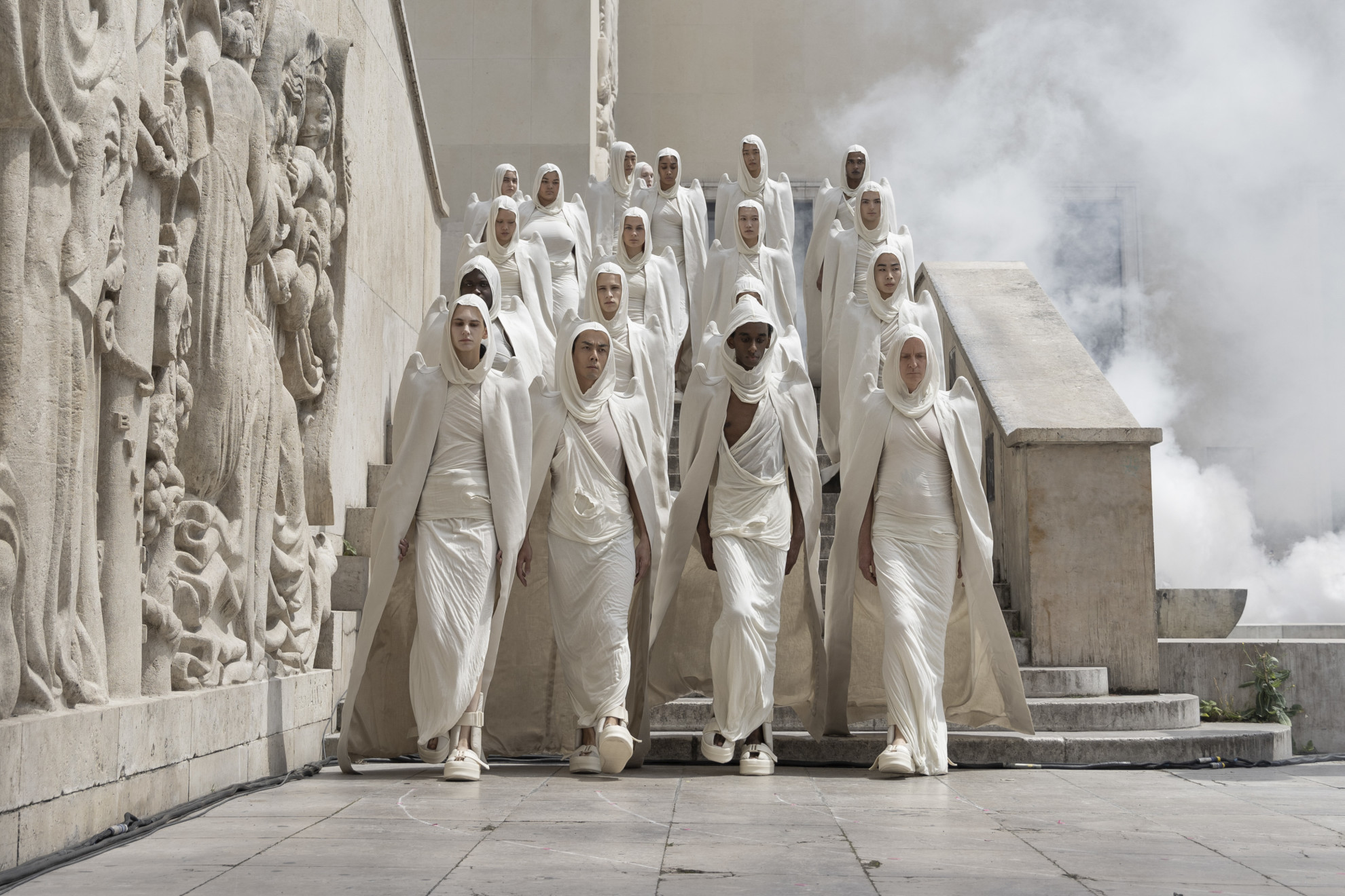 Rick Owens 2025 春夏系列秀在巴黎东京宫展览大厅上演,以贝多芬的第七交响曲 Allegretto 作为秀场背景音乐。此次大秀只有 10 个造型,但召集了约 200 名模特进行演绎。模特们以四人一排、五列纵队的方式出场,现场弥漫一丝神圣和严肃的氛围。其中出场的一组模特身穿 Tanja Vidic 设计的裹身针织衫、侧开衩短裤和 Geobasket 运动鞋,抬着三名穿着紧身胸衣的体操运动员,手举印有握手图案的旗帜,场面极其壮观。服装设计方面,系列包含了曾在以前作品中出现过的骑士和牛仔元素,包括附着厚重硬朗涂层的衣物,也有一些呈现出粉状、黏稠或金属质感的款式。鞋履再次出现去年充满话题性的充气靴,这次以全新皮革版本呈现。薄纱头巾环绕面部,肩部设计成惊叹号形状,增加戏剧效果。此次大秀通过多样化的模特群体展示了对身体类型的思考,体现了包容性和社群意识。通过多样化的展示,Rick Owens 再次挑战传统美学观念,鼓励人们思考不同的美学和相互对待的方式。